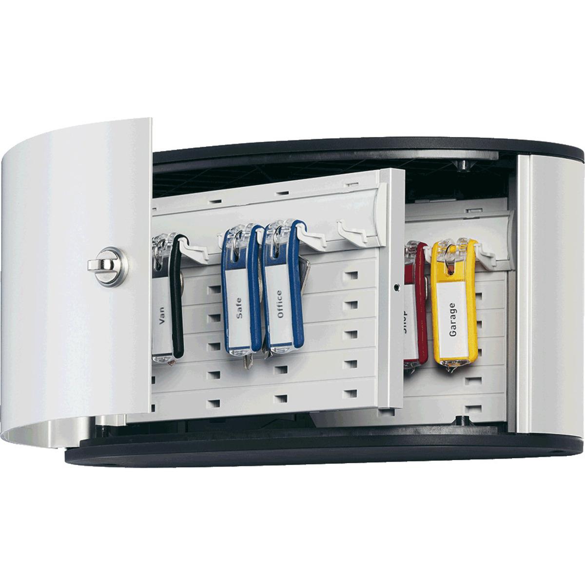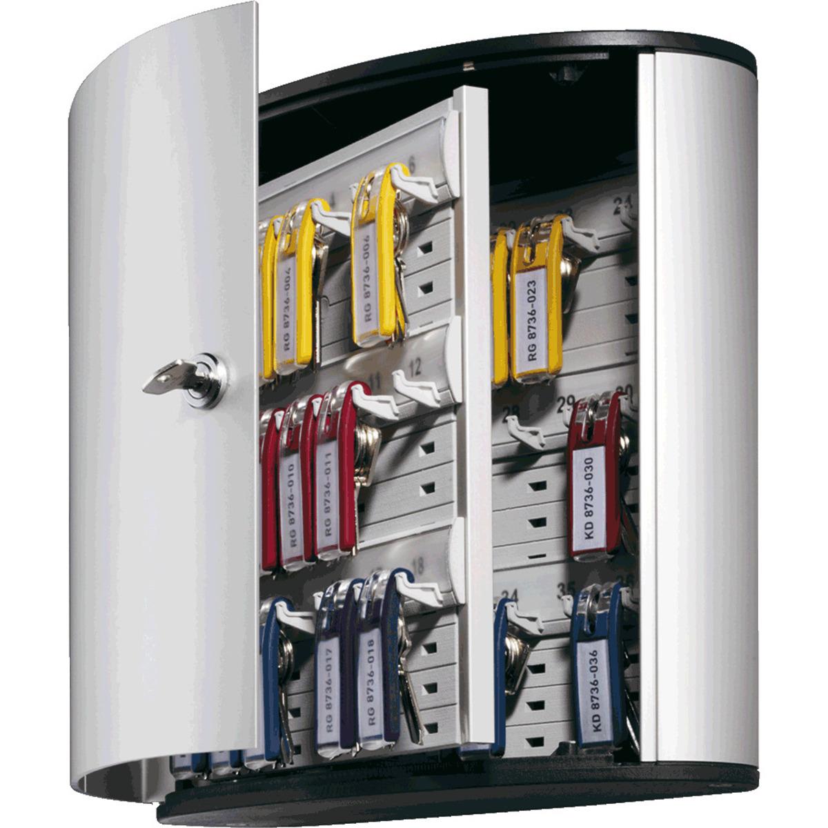 DURABLE Key Box, praktische Schlüsselboards und passende Anhänger. Mit speziellen Schlüsselleisten, auf denen die Schlüssel mit Anhänger permanent übersichtlich und sicher hängen. Die variable Steckhöhe ermöglicht eine individuelle Nutzung. Einfache Wandmontage