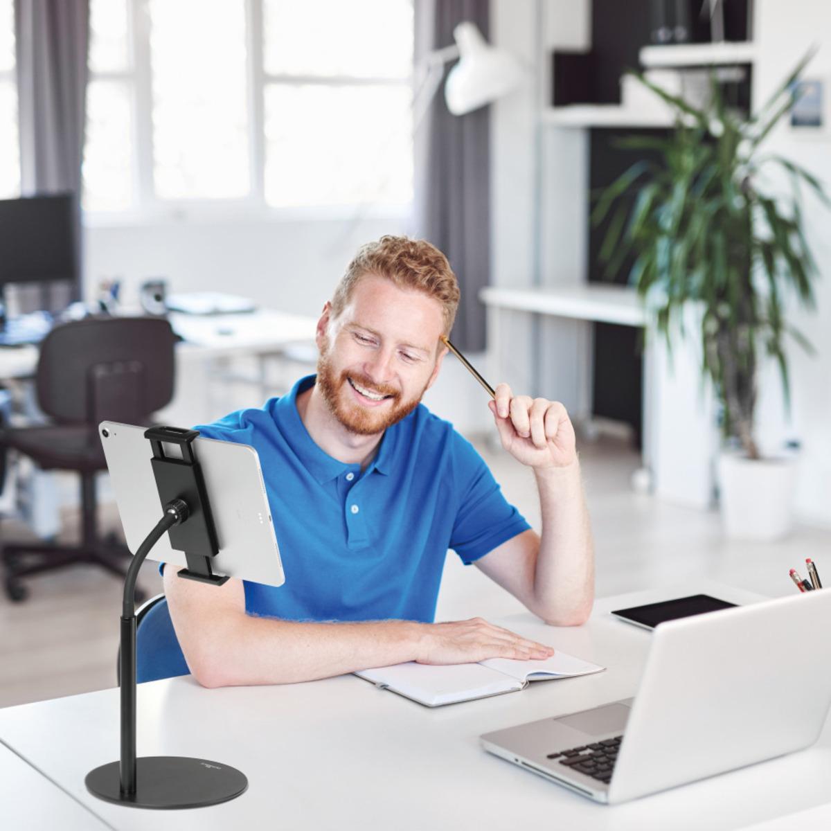 Der Tischständer ist für Tablets und Handys geeignet. Dieser hat eine stufenlose Drehbarkeit und Höheneinstellung durch flexiblen Arm. Außerdem ist dieser besonders ergonomisch durch den flexiblen Schwanenhals der eine individuelle und stufenlose Höheneinstellung ermöglicht. Die rutschhemmenden Pads in der Klemme halten das Tablet oder Handy stabil fest und schützen vor Kratzern. Kabelführung durch integrierten Kabelauslass in der Klemme. Der Tischständer ist durch die 360-Grad-Drehung in jeden Winkel verstellbar.