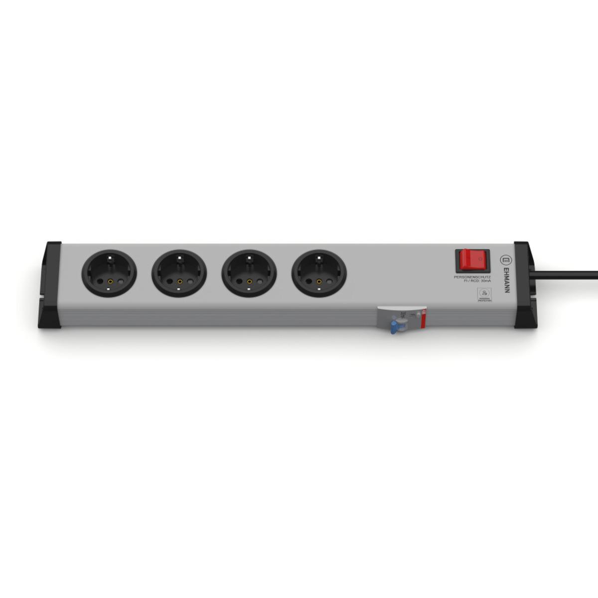 Steckdosenleiste mit Fi-Schutzschalter 4-fach, robustes Kunststoff, mit 2 poligem, beleuchtetem Schalter und Endkappe mit Befestigungsmöglichkeit, der eingebaute FI-Schutzschalter bietet optimalen Personenschutz und schaltet die Steckdose bei gefährlichen Fehlerströmen in weniger als 30 ms ab, schützt anweder und Elektrogeräte.