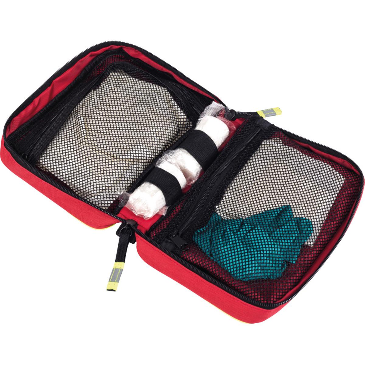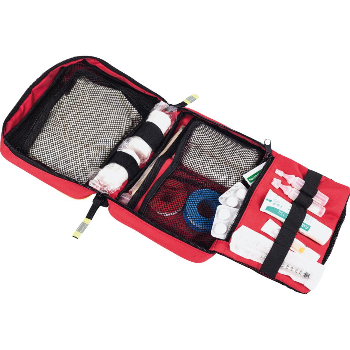 Aufklappbare Erste-Hilfe-Tasche in kompakter Größe, ideal für die übersichtliche Aufbewahrung von Erste-Hilfe-Material oder zum Mitnehmen wichtiger Verbandstoffe auf Einsätzen unterwegs.