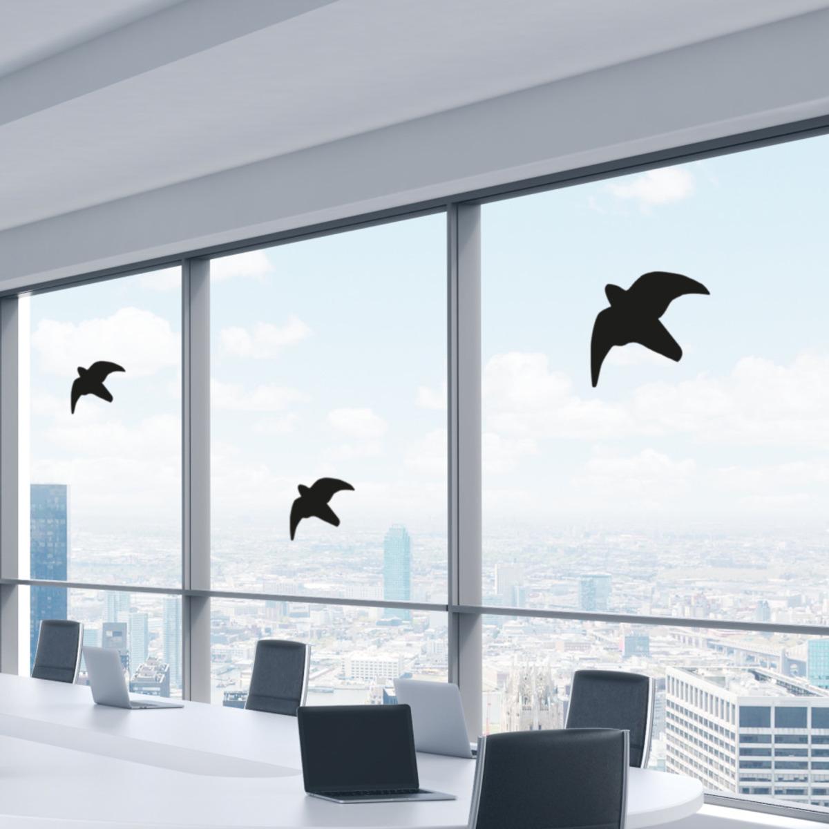 Das Fensteraufkleber-Set mit Vögeln als Motiv verhindert, dass Vögel gegen große Glas- und Fensterflächen fliegen. Die Tiere können Glas oft nicht als Hindernis erkennen, besonders wenn es reflektiert und durchsichtig ist, und fliegen in der Folge dagegen. Mit dem Anbringen mehrer Aufkleber an Ihren Fenstern schützen Sie die Tiere davor.
