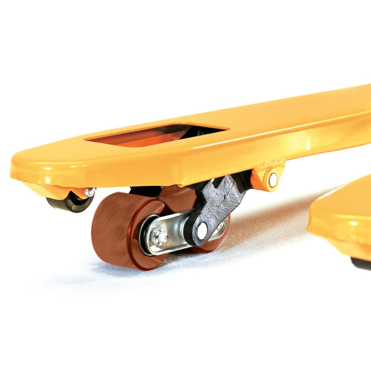 fetra® Gabelhubwagen mit Rahmen und Gabeln in verwindungsfreier Schalenbauweise, hydraulische Handpumpe wartungsfrei gelagert, stabile Stahlrohrdeichsel mit Gegenlager für Schubbetrieb, Griff gummiummantelt, Bedienhebel für die Funktionen: Heben, Fahren, Senken, geringer Rollwiderstand, elastischer Lauf, auch geeignet für unebene Böden und beim Überfahren von Kanten und Schwellen, Kletterrollen an den Gabelspitzen, geringe Fahrgeräusche.