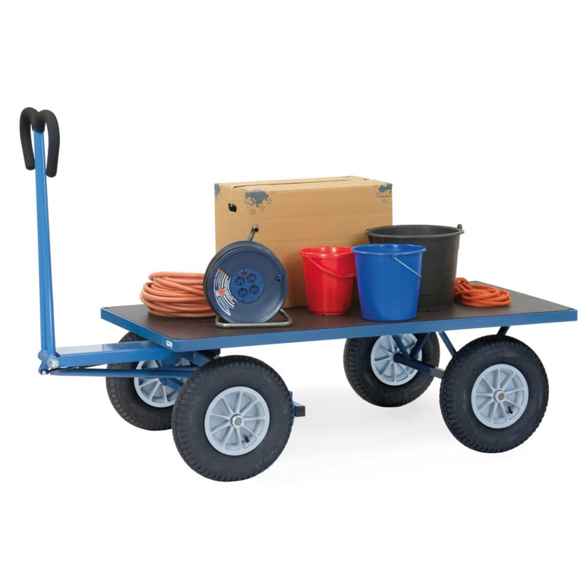 fetra® Handpritschenwagen mit Drehschemel-Lenkung mit Kugelkranz, Scherendeichsel mit Sicherheits-Handgriff mit Softgrip-Bezug und automatischer gedämpfter Rückstellung in Ruheposition, Ladefläche belegt mit rutschsicherer Siebdruckplatte aus wasserfestem Sperrholz, Räder mit Luftbereifung, Naben mit Rollenlager, automatische Feststellbremse der Vorderräder.