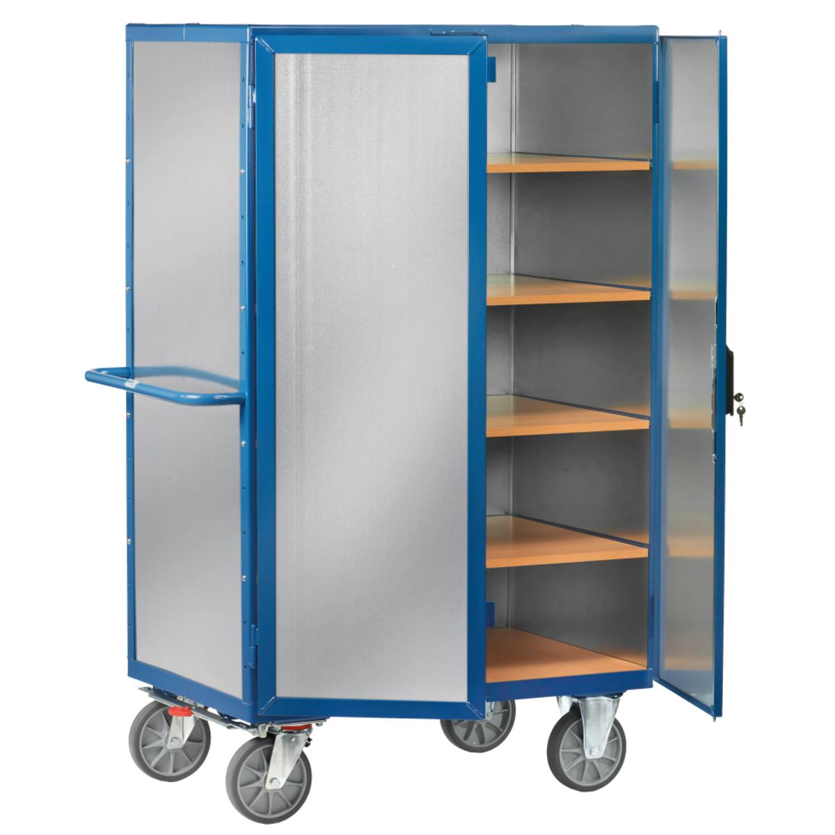 fetra® Kastenwagen mit Stirnwänden, Längswand, Flügeltüren und Dach aus verzinktem Stahlblech. Die Doppel-Flügeltür besteht aus Winkelstahl mit Treibriegelverschluss, Schwenkhebel und eingebautem Zylinderschloss. Außerdem hat der Wagen einen festen und 4 lose Böden. Die Böden bestehen aus tragfähigen, biegesteifen Sandwichplatten. Die 2 Lenk- und 2 Bockrollen und der geringe Anfahr-, Roll- und Schwenkwiederstand sorgen für einen geräuscharmen Lauf.