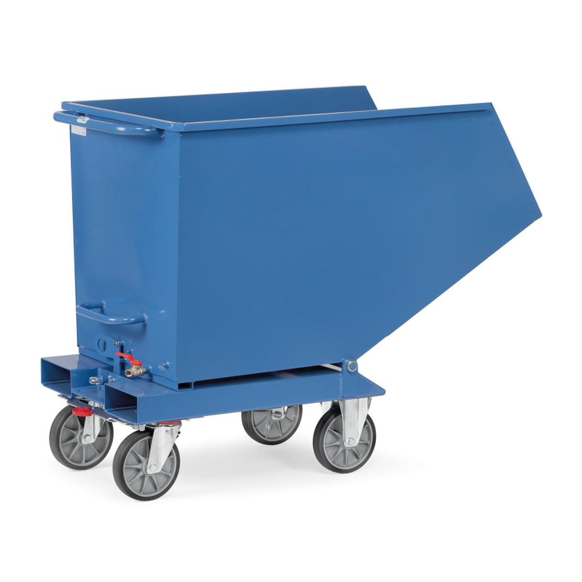 fetra® Muldenkipper mit Trittblech und Kippsicherung, Rand oben zweimal umgekantet, Schüttkante doppeltumgelegt, öldicht verschweißt, mit integrierten Staplertaschen, 2 Lenk- und 2 Bockrollen, TPE-Bereifung, Naben mit Rillenkugellager, TOTALSTOP-Zentralbremssystem serienmäßig an den Lenkrollen mit Ablasshahn mit Sieb zum Trennen von Flüssigkeiten und Feststoffen.