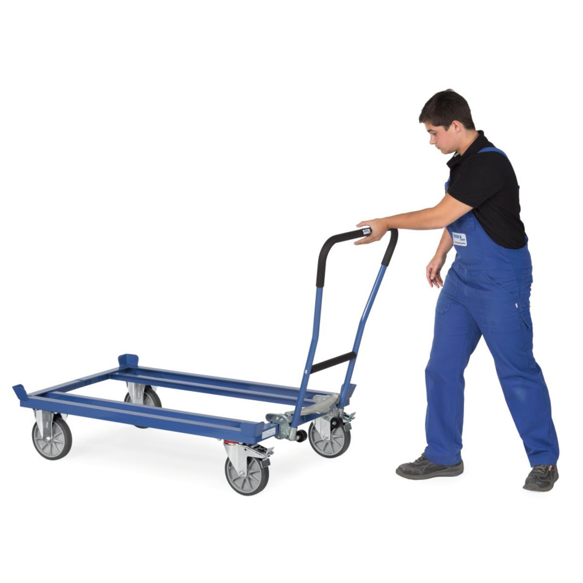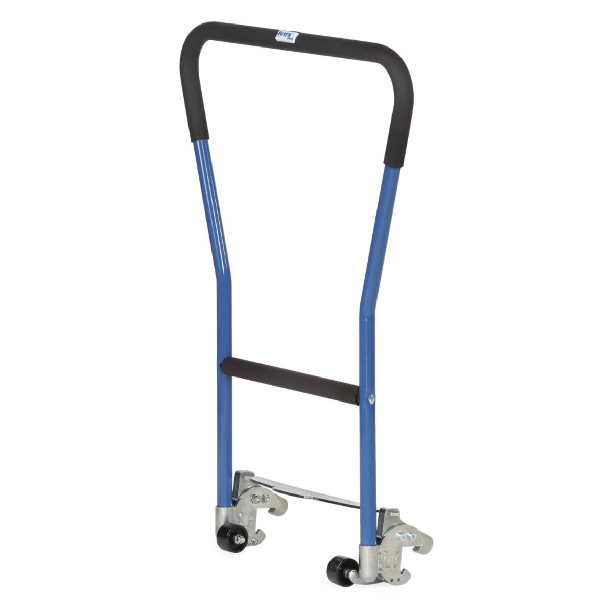 Rohrschiebebügel zum bequemen rückenschonenden Bewegen von leeren und beladenen Paletten-Fahrgestellen, Konstruktion mit kräftigen Verbindungsklauen, Bügel und Querbügel mit Softgrip-Bezug. Im ausgeklinkten Zustand mittels 2 Hilfsrollen kräfteschonend verfahrbar.