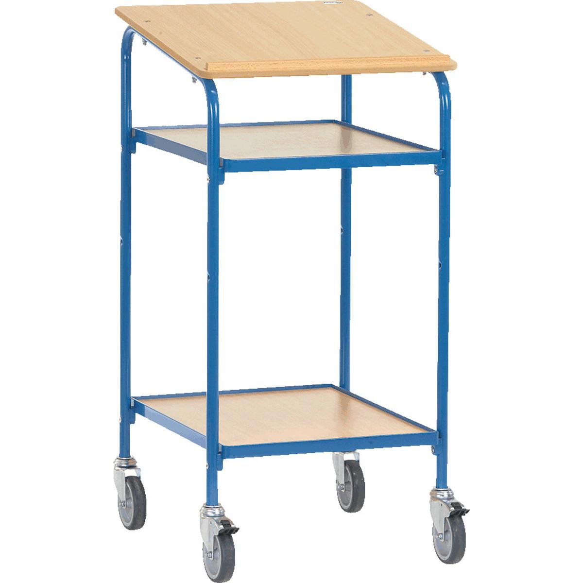 Praktisches fetra Rollpult mit Schreibfläche und variabel verschraubbaren Böden, vielseitig für den innerbetrieblichen Transport oder als fahrbares Aufbewahrungsystem mit Schreibtischunterlage nutzbar, leicht laufende Lenkrollen mit Feststeller, großer Raddurchmesser