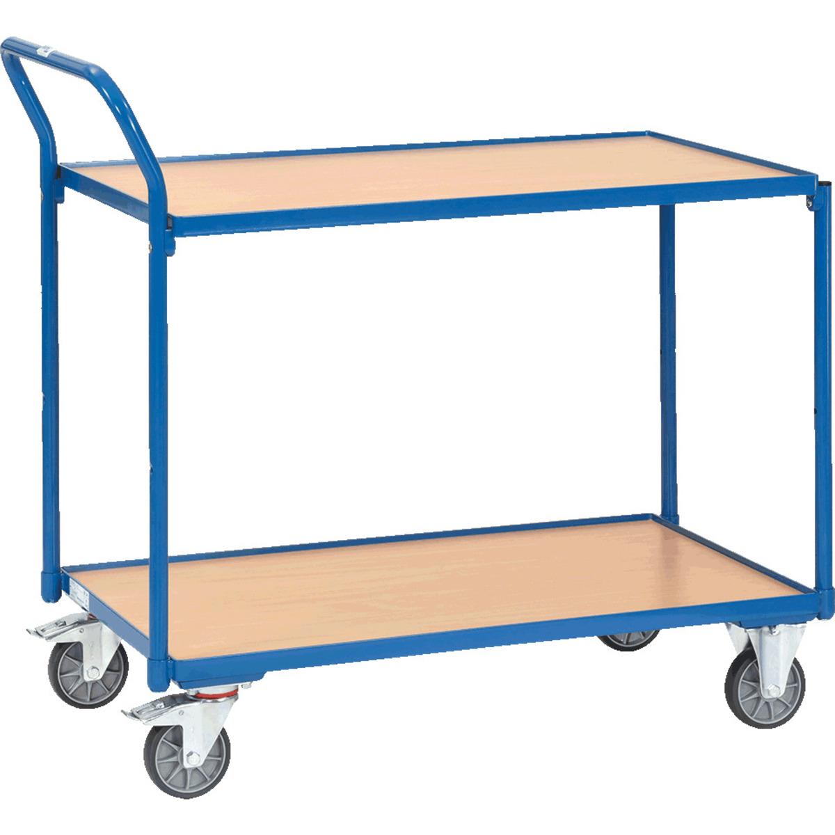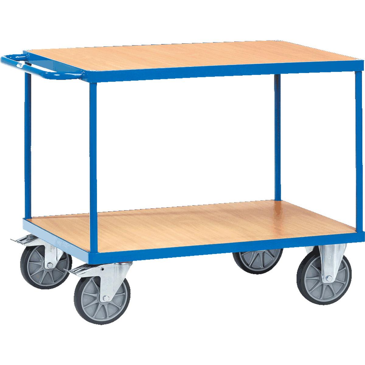 fetra® Tischwagen für den schnellen Transport im Betrieb oder als zusätzlicher mobiler Arbeitstisch bzw. Werkbank, hochstehender Griff hochstehend, Schraubkonstruktion, 2 Lenk- und 2 Bockrollen, Naben mit Rollenlager, Feststeller an den Lenkrollen