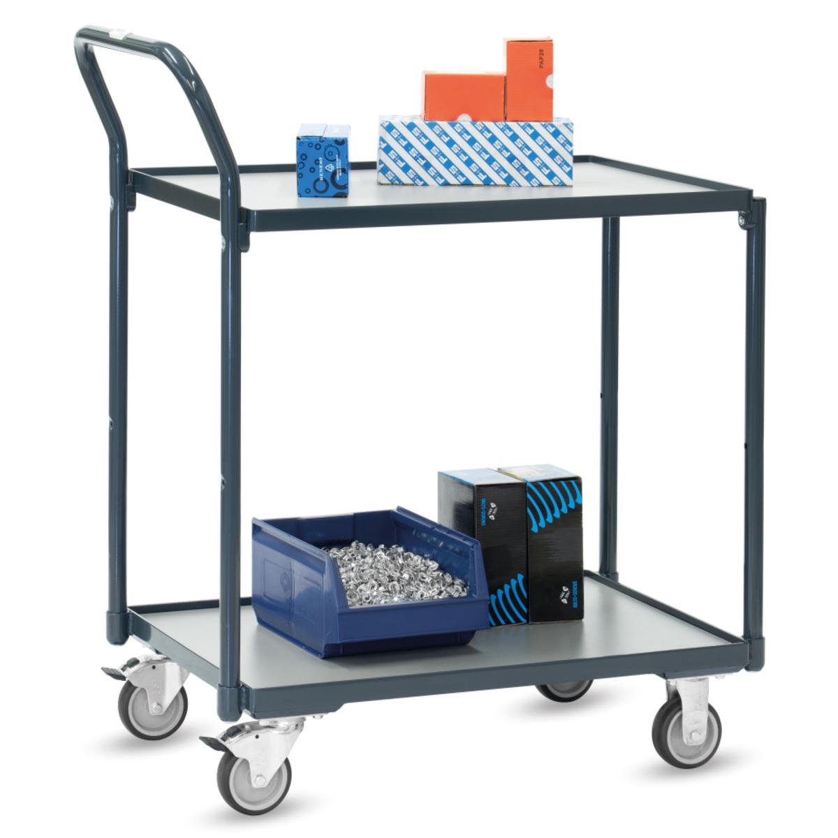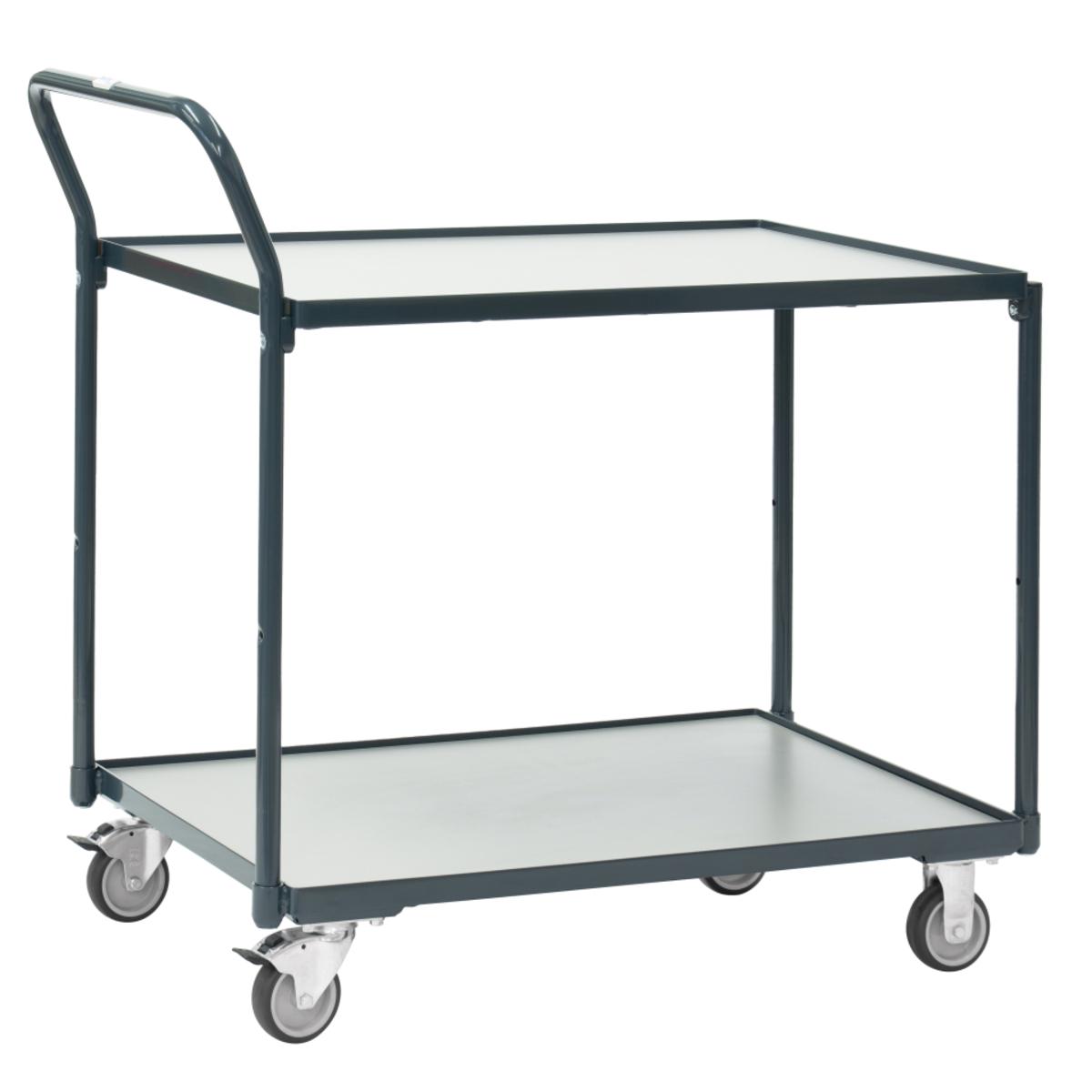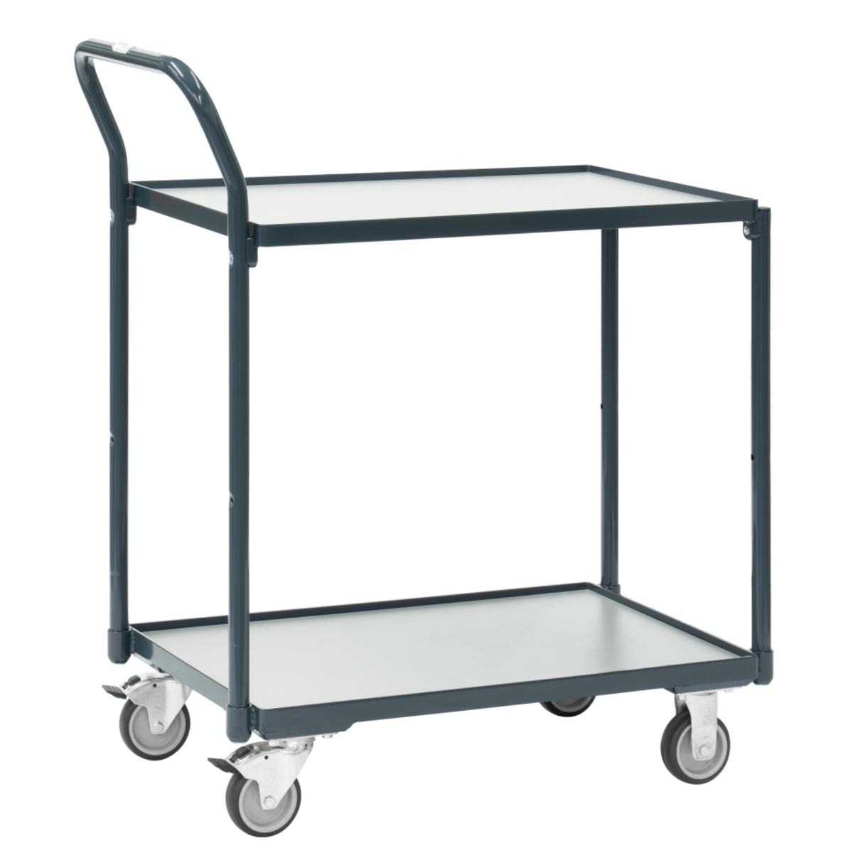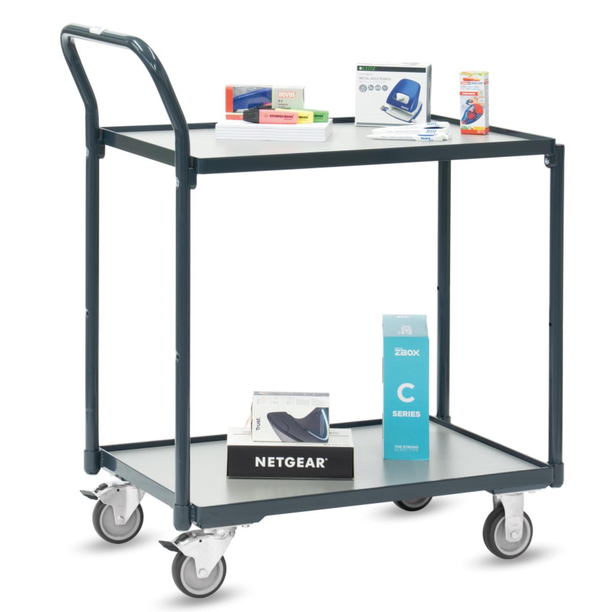 kompakter und handlicher Tischwagen für den flexiblen Einsatz in Büro, Lager und Werkstatt, 2 Böden aus Holzwerkstoffplatte, im Stahlrahmen liegend, Rand 12 mm hoch, Schiebegriff hochstehend, 2 Lenk- und 2 Bockrollen, TPE-Bereifung, Naben mit Gleitlagerung, Feststeller an den Lenkrollen, Tragkraft obere Ladefläche 80 kg, leichte Selbstmontage