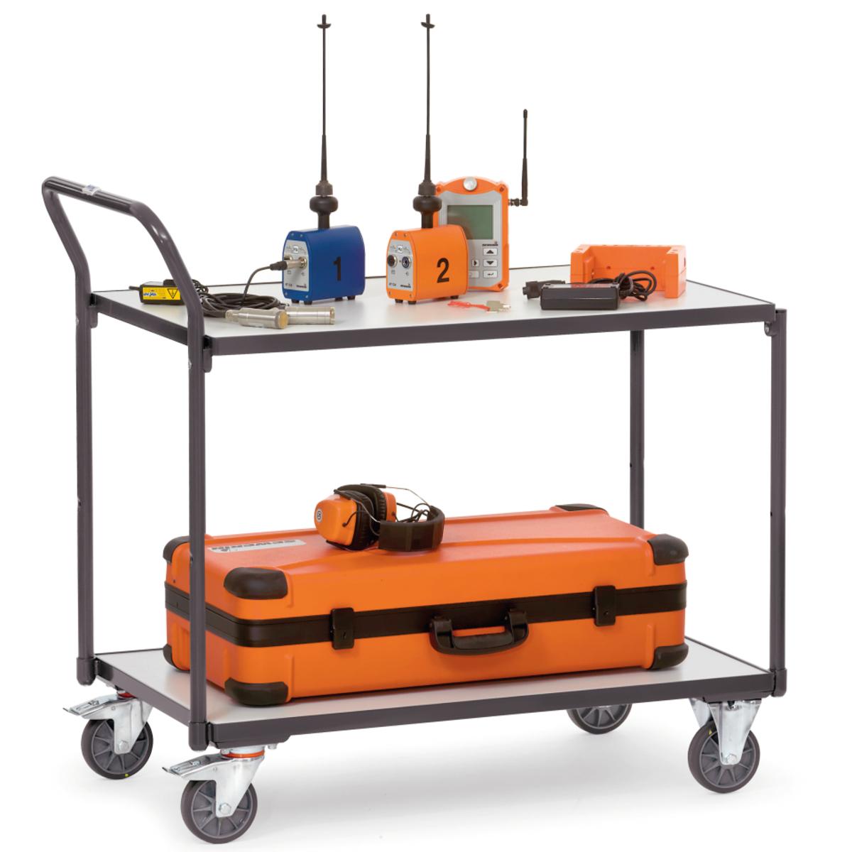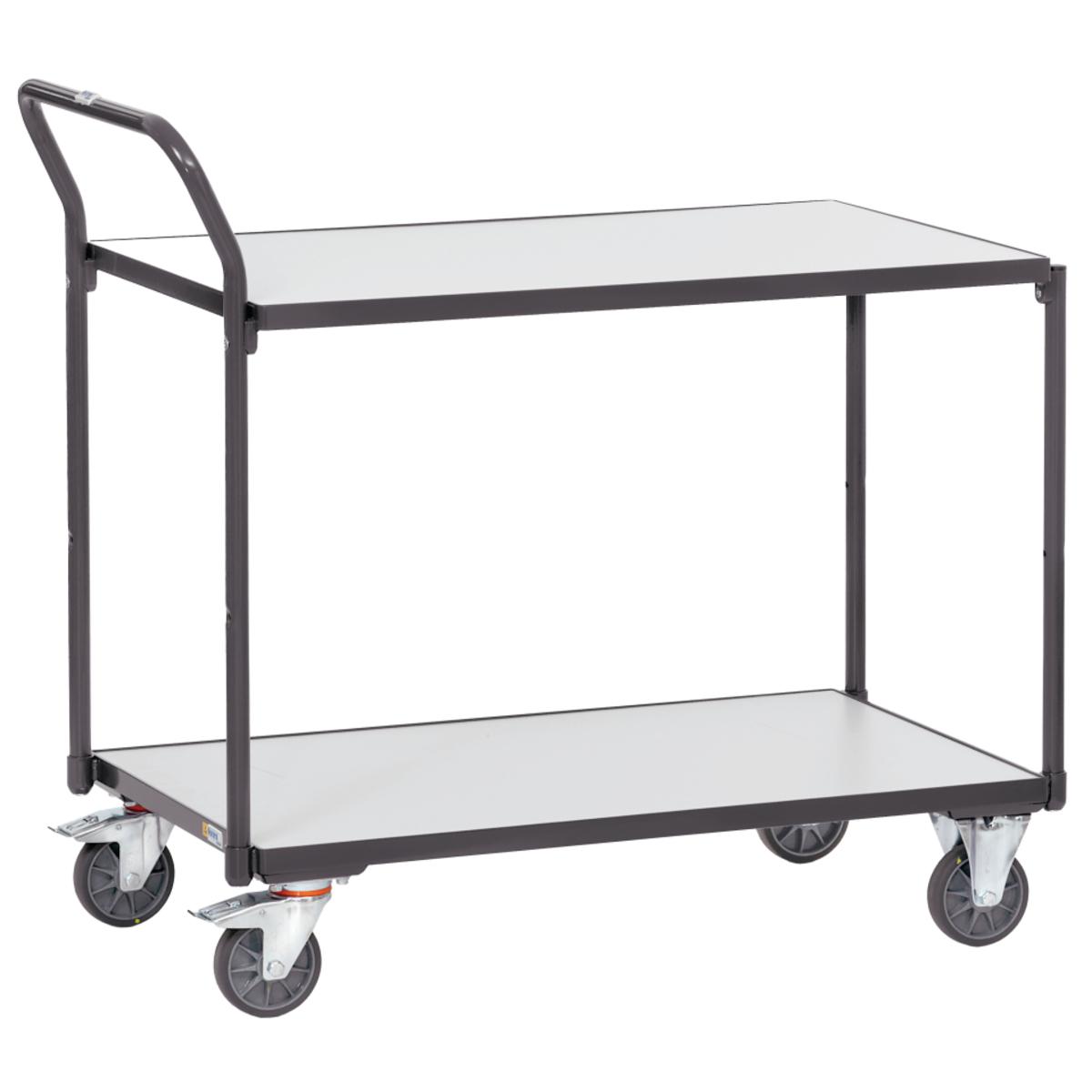 2 Böden im Stahlrahmen, 2 feststellbare Lenkrollen und 2 Bockrollen, Ø 125 mm, Handgriff hochstehend, Holzwerkstoffplatte, mit TOTALSTOP Zentralbremssystem, Naben mit Rillenkugellager, stabile Konstruktion, TPE-ESD-Bereifung