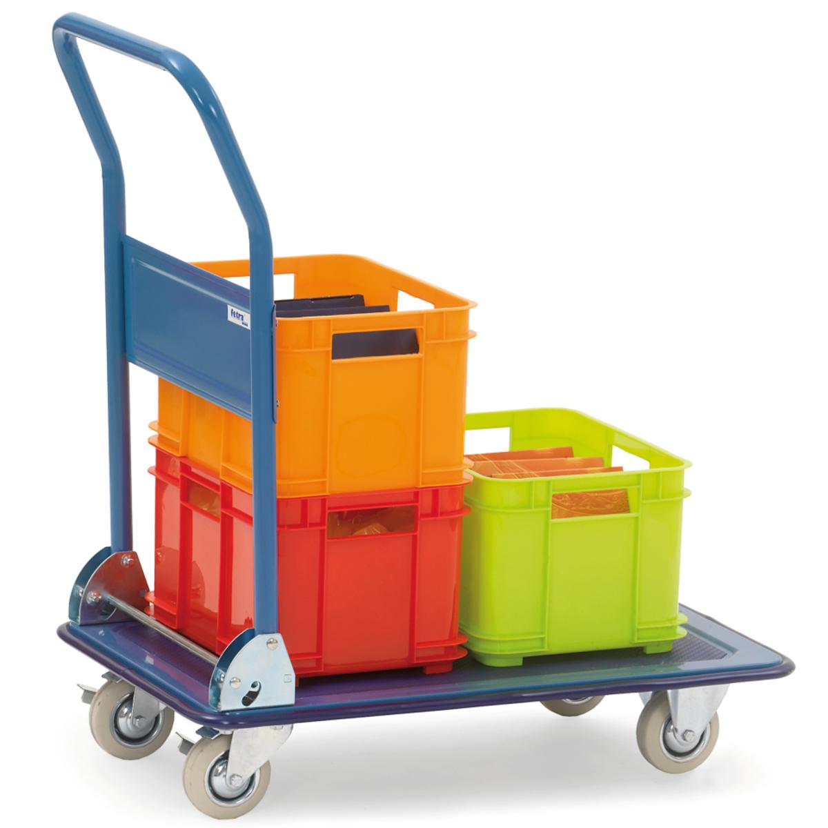 2 Bockrollen, 2 Lenkrollen, Feststeller an den Lenkrollen, Rohr-Schiebebügel, rutschfester Boden, Schiebebügel auf Plattform klappbar, umlaufende Schutzleiste, Vollgummibereifung