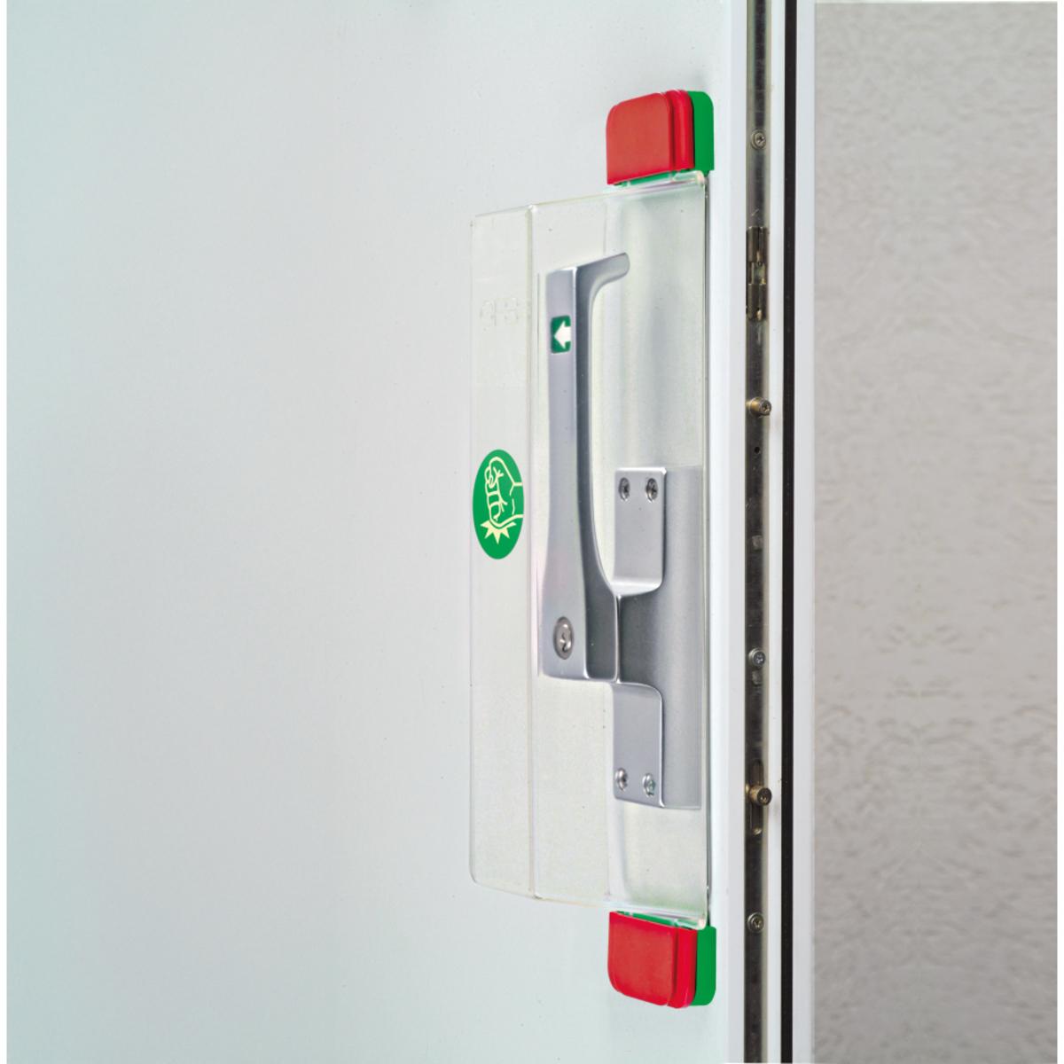 Die Plastikhaube arbeitet mit einem Sicherheitsverschluß, einer Sollbruchstelle und einer rot-grünen Kennzeichnung. Nach dem Abschlagen der Haube ist der Türgriff wie gewohnt zu verwenden. Durch die Farbgebung (rot-grün) kann man schon von weitem sehen, ob die Haube noch arretiert oder ob diese frei ist. Zum erneuten Sichern des Türgriffes bzw. zum Verschließen der Haube befestigt man nur die neuen roten Befestigungslaschen an den dafür vorgesehenen Montageorten.