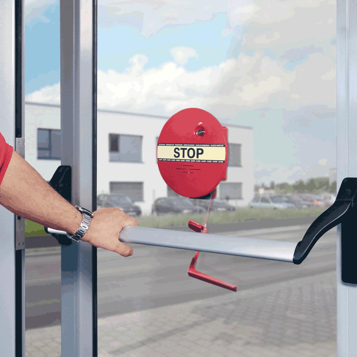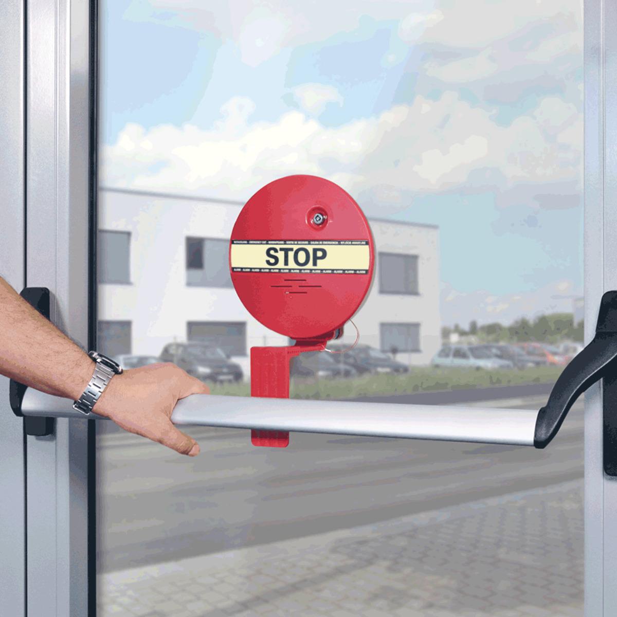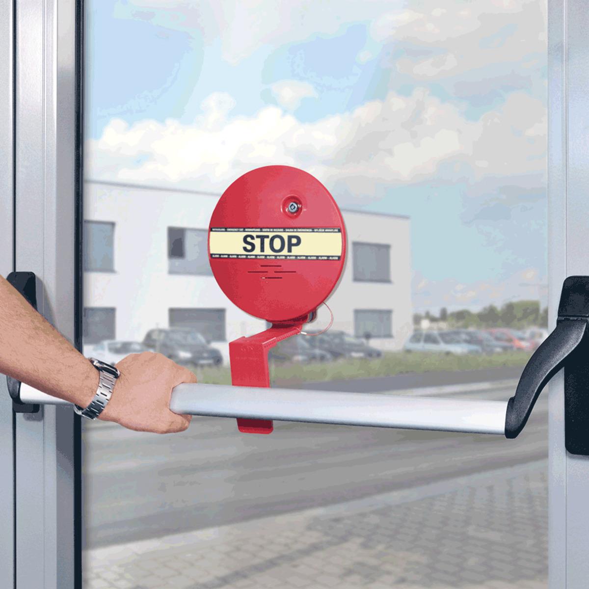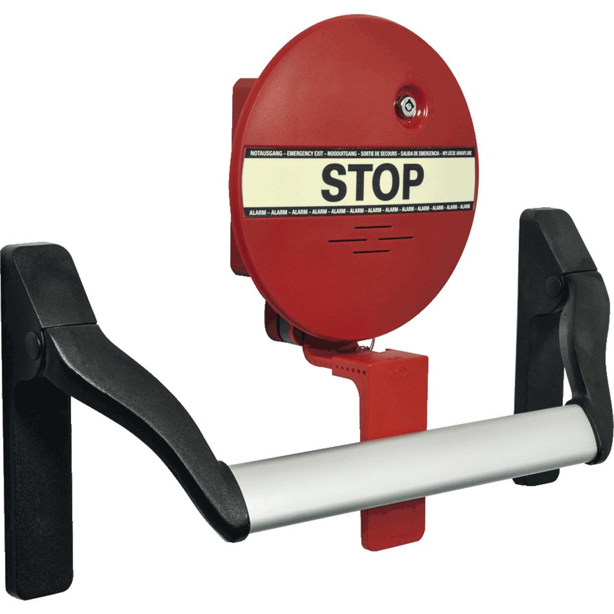 Fluchtwegsicherung DEXCON für Stangenriff um den Verschluss von Türen im Verlauf von Rettungswegen zu überwachen, Meldung bei unbefugtem Zutritt über ein akustisches Signal, Lautstärke des Alarmgebers auf 95 dB/1 m eingestellt, kann jedoch auf ca. 75 dB/1 m gedrosselt werden, Alarmabschaltung über den Geräteschlüssel.