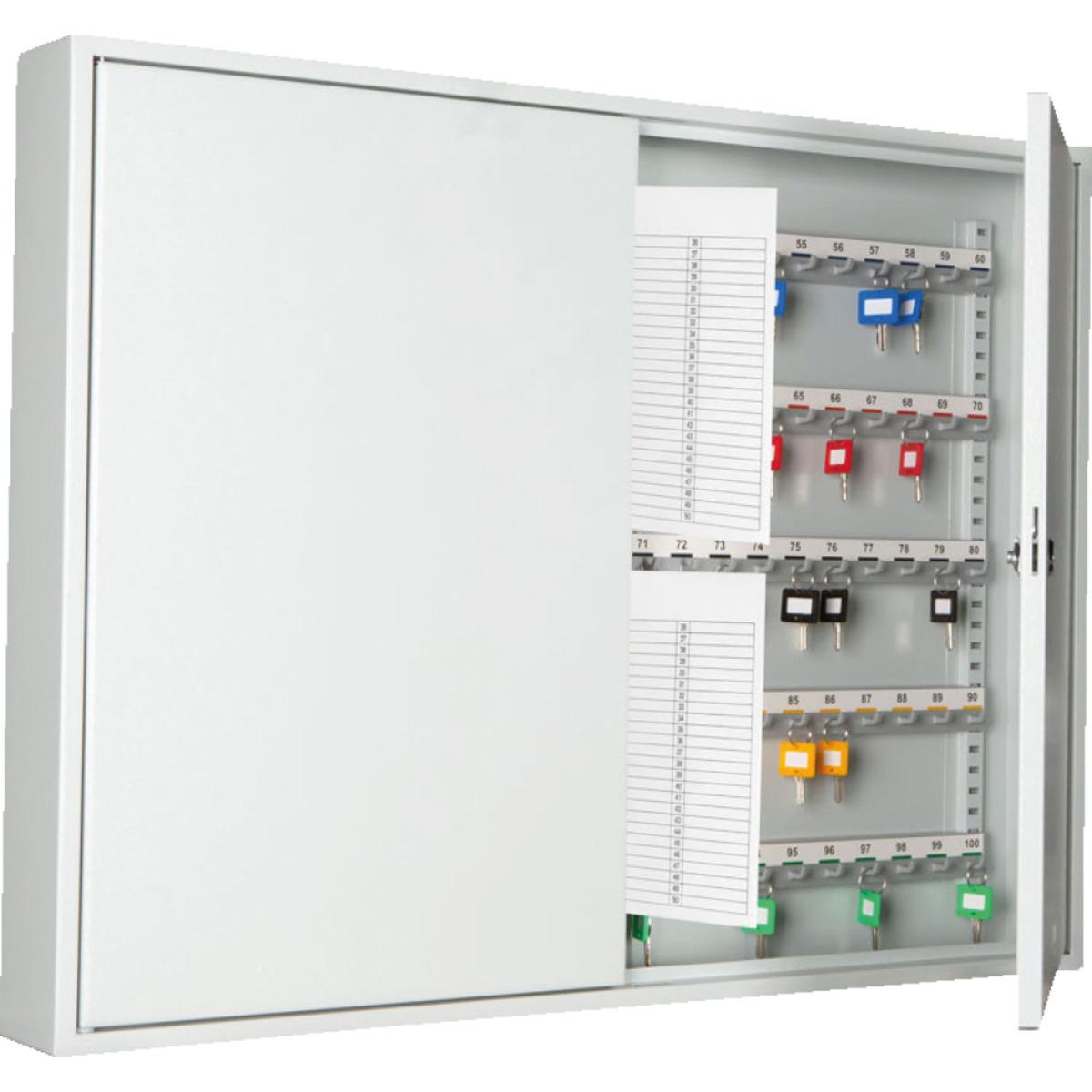 FORMAT Schlüsselschränke, Modell SZ, mit voll schwenkbarem Schlüsselregister. Zweitürige Ausführung zur Wandbefestigung . Glatte Vorderfront durch eine innenliegende Tür mit umlaufendem Rand. Hakenleiste im Rastersystem verstellbar, fortlaufend nummeriert und verschiedenfarbig.