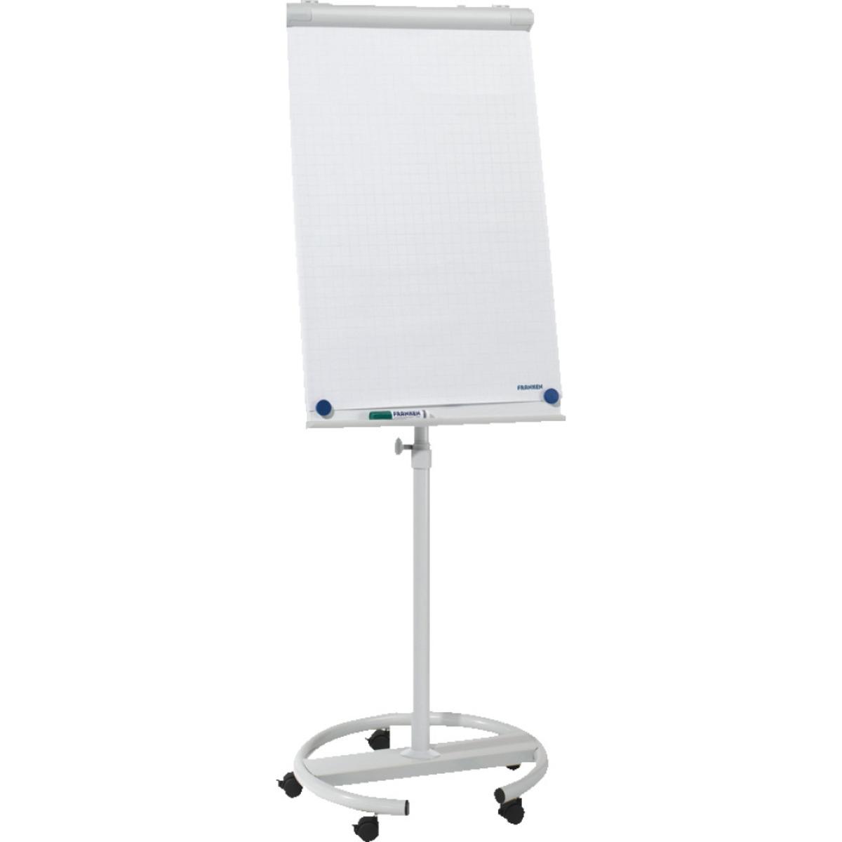 FRANKEN Flipchart ECO/Mobil, mit Schnellwechselhalterung für alle gängigen Flipchart-Blocks. Magnethaftende Schreibtafeloberfläche inklusive Ablageschale. Erweiterbare Präsentationsfläche durch 2 zusätzliche Seitenarme. Rundfuß aus Metall mit feststellbaren Laufrollen. Stufenlos höhenverstellbar