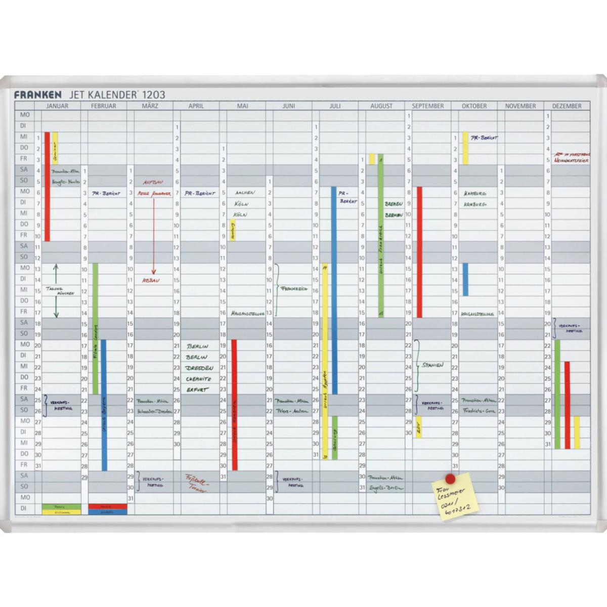 FRANKEN Jahresplaner 12 Monate, Januar bis Dezember und Wochentage sind fest eingedruckt. Umweltfreundlich, da jedes Jahr neu verwendbar. Mit waagerechten Tagesfeldern zum handschriftlichen Eintragen der Termine und Daten. Magnethaftende Schreiboberfläche. Mit passenden Zubehör