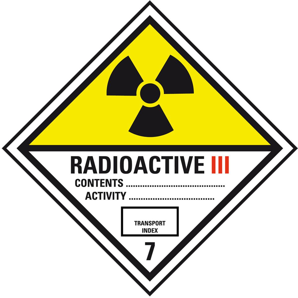 Informieren Sie mit dem Gefahrgutzettel Klasse 7C - "Radioaktive Stoffe Kategorie III" Spediteure und Empfänger über Inhalt und Handhabung der Versandstücke, um die Sicherheit des Gefahrguts und der beteiligten Personen zu gewährleisten.