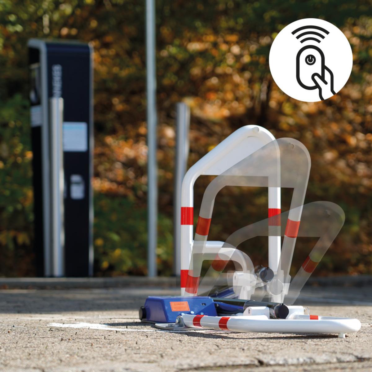 Der kleine, handliche Handsender für den automatischen Parkbügel mit smarter App-Steuerung verbindet sich per Bluetooth mit dem Parkbügel, öffnet und schließt diesen per Knopfdruck, keine App notwendig.
