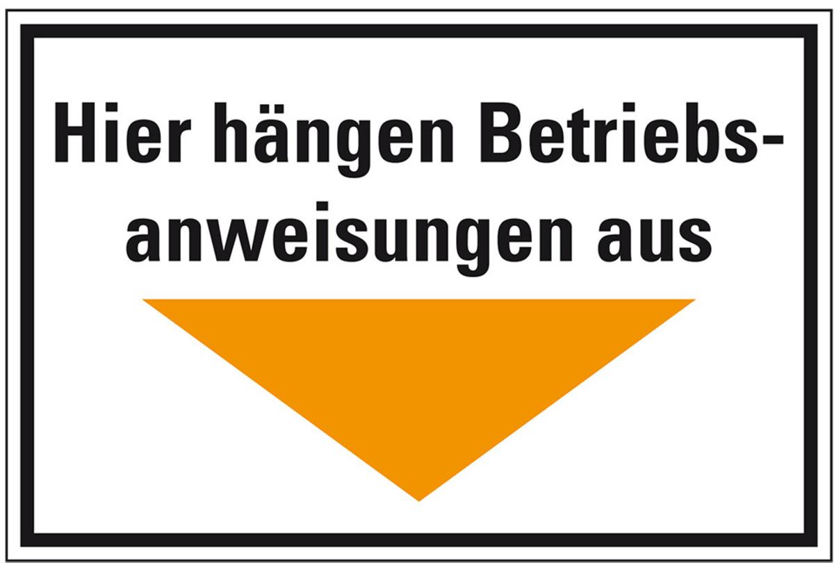 Hinweisschild mit Pfeil und Text "Hier hängen Betriebsanweisungen aus".