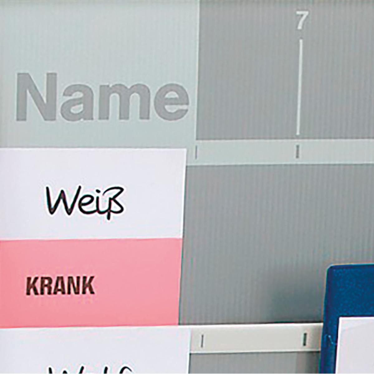 Index-Karten zum Einstecken in die Planungstafel, wahlweise vorbeschriftet mit "Urlaub" oder "Krank" oder unbeschriftet zur individuellen Beschriftung mit Mitarbeiternamen, Wochentagen, Fahrzeugen etc.