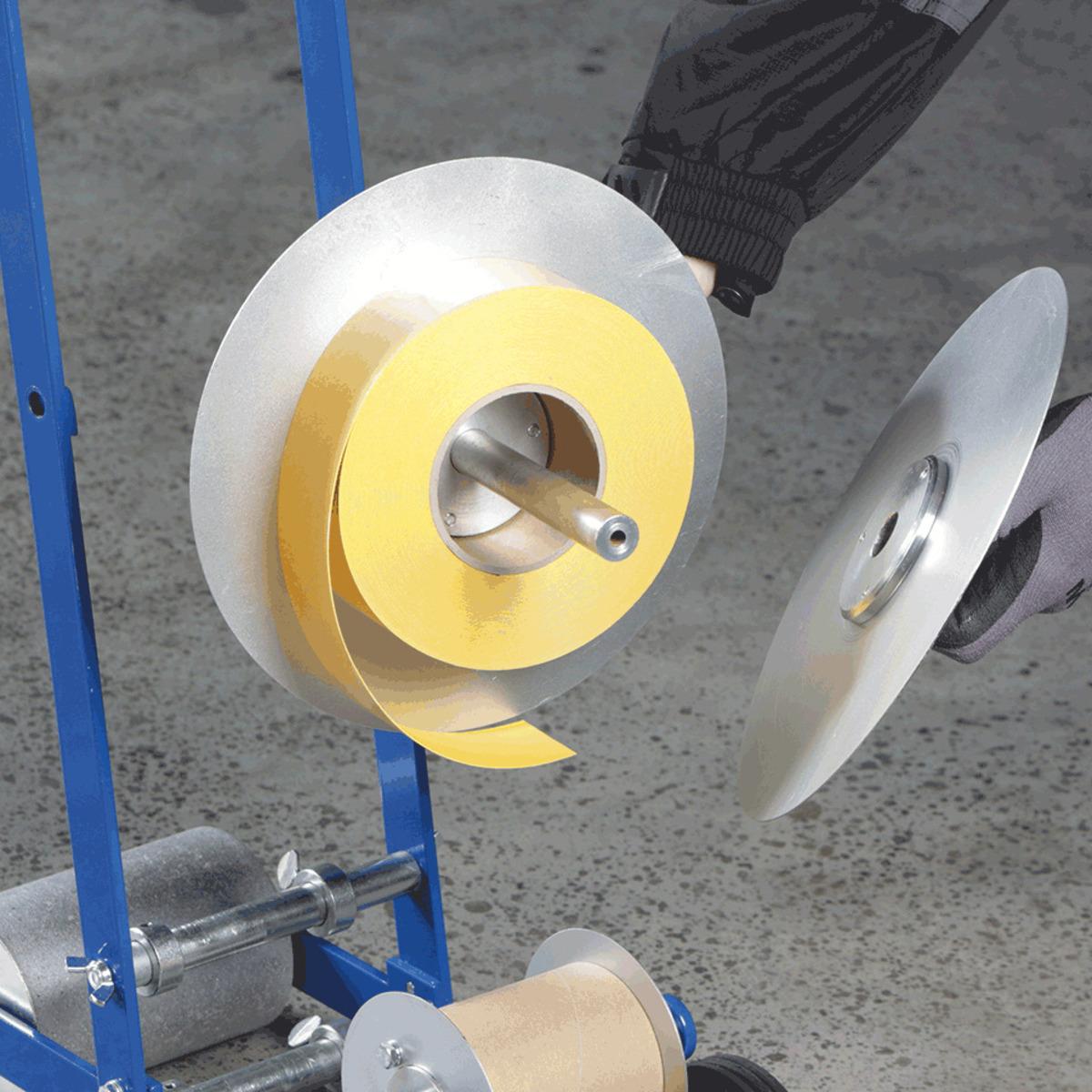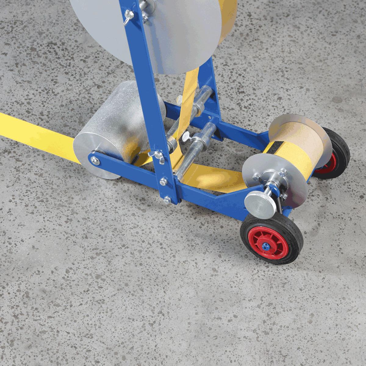 Abrollgerät Tape Master zum Aufbringen von selbstklebenden Bodenbändern und Antirutschbelägen, für alle Bänder mit Trägerfolie sowie ohne Trägerfolie bis 100 mm Bandbreite, automatischer Abzug der Trägerfolie beim Verkleben des Bandes