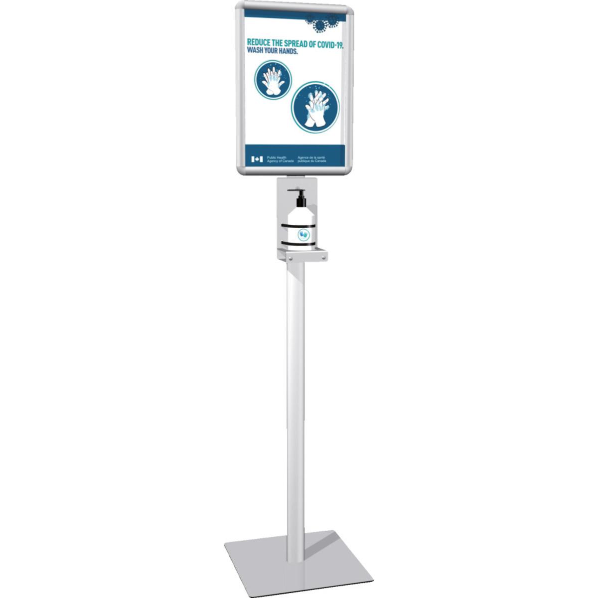Bodenständerfür die Bereitstellung von Desinfektionsmittel mit DIN A3-Klapprahmen zum Einlegen von Informationen, Fixierung des Desfinektionsmittels mit Hilfe von 2 mitgelieferten Kabelbindern (Diebstahlschutz).