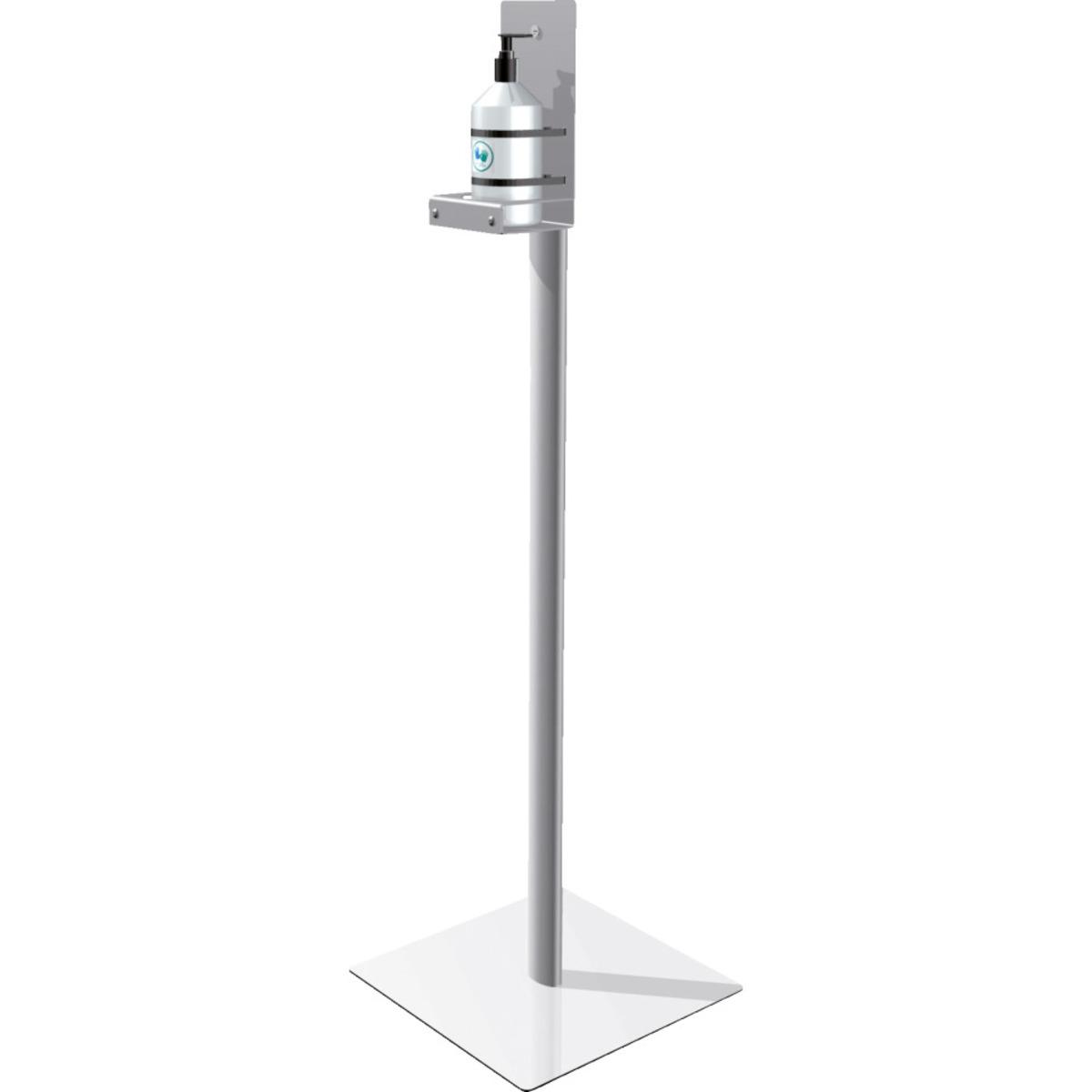 Bodenständer zur Bereitstellung von Desinfektionsmittel. Fixierung des Desfinektionsmittels mit Hilfe von 2 mitgelieferten Kabelbindern (Diebstahlschutz).