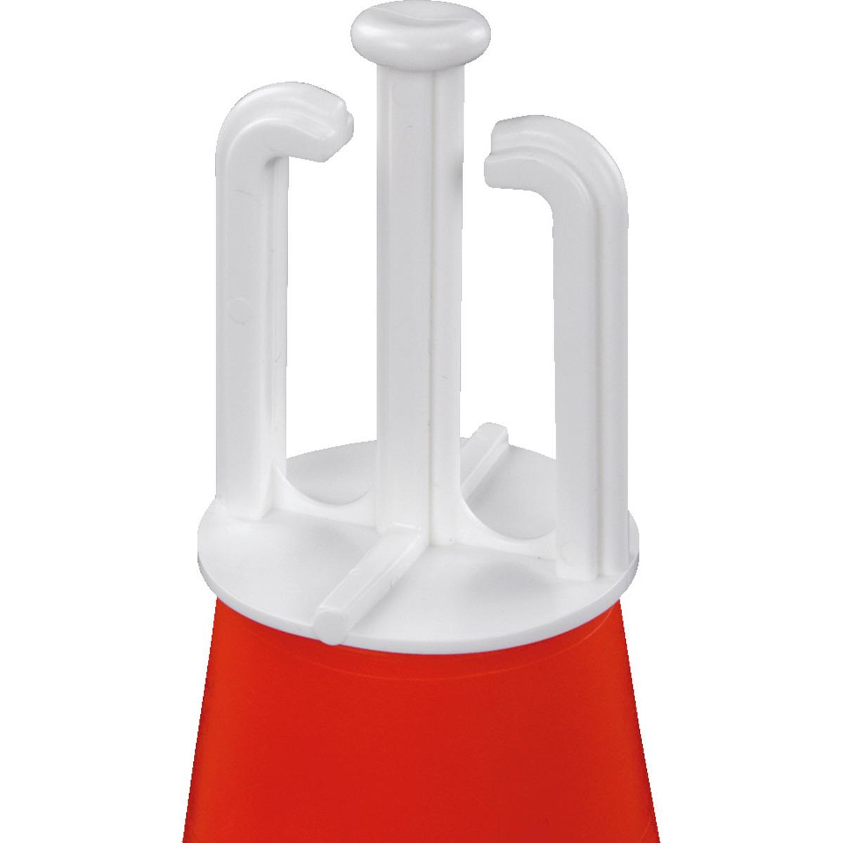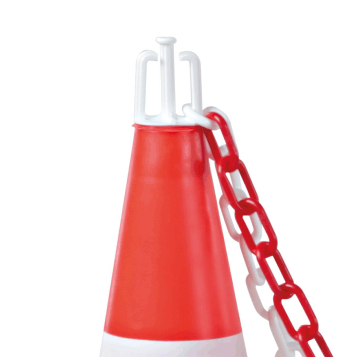 Einhängehaken für Leitkegel zum Befestigen von Absperrketten oder Absperrband, mehrere Kegel können so miteinander verbunden werden und eine wirksame Gefahrstellensicherung bilden, einfach aufzustecken, frei drehbar, passt auf fast alle Kegelöffnungen