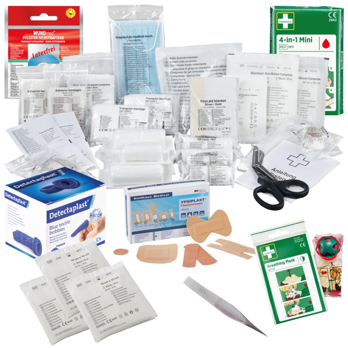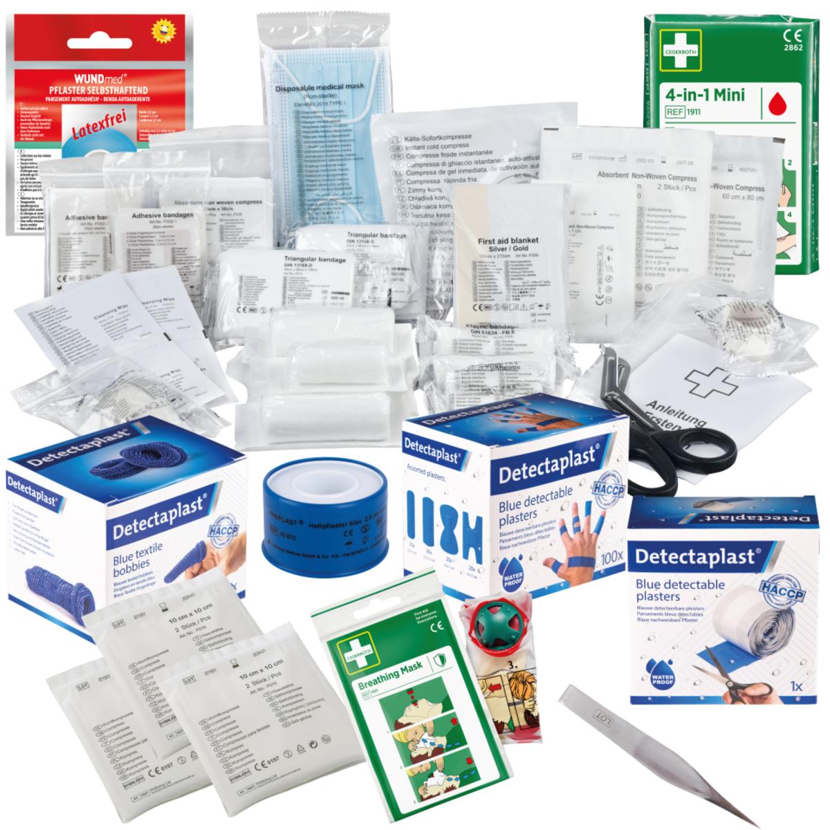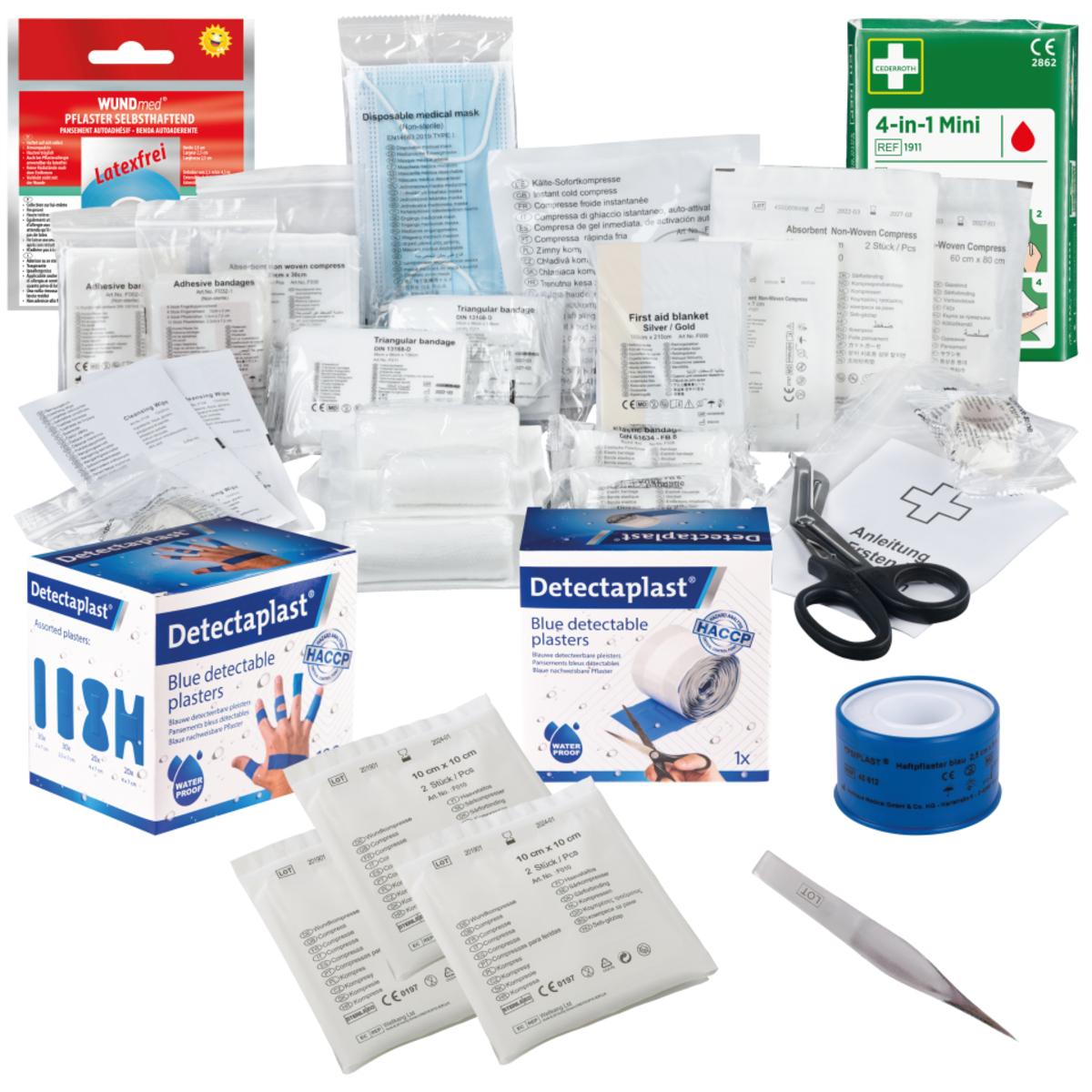 Hygienisch verpacktes Nachfüllset für Erste-Hilfe-Koffer, -Schränke und Verbandkästen gemäß aktueller Norm mit zusätzlichem Verbandmaterial und Pflastern speziell für Lebensmittel verarbeitende Betriebe.