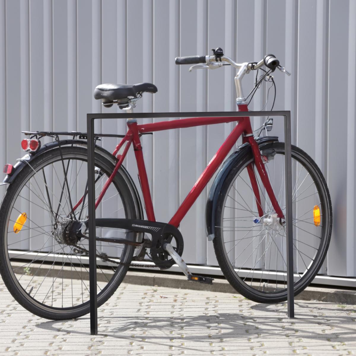 Hochwertiger, freistehender Anlehnbügel aus Flachstahl zum beidseitigen Anschließen von Fahrrädern.
