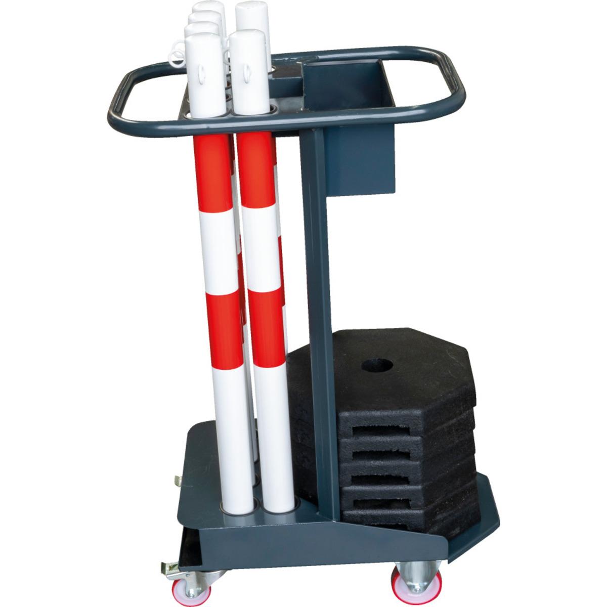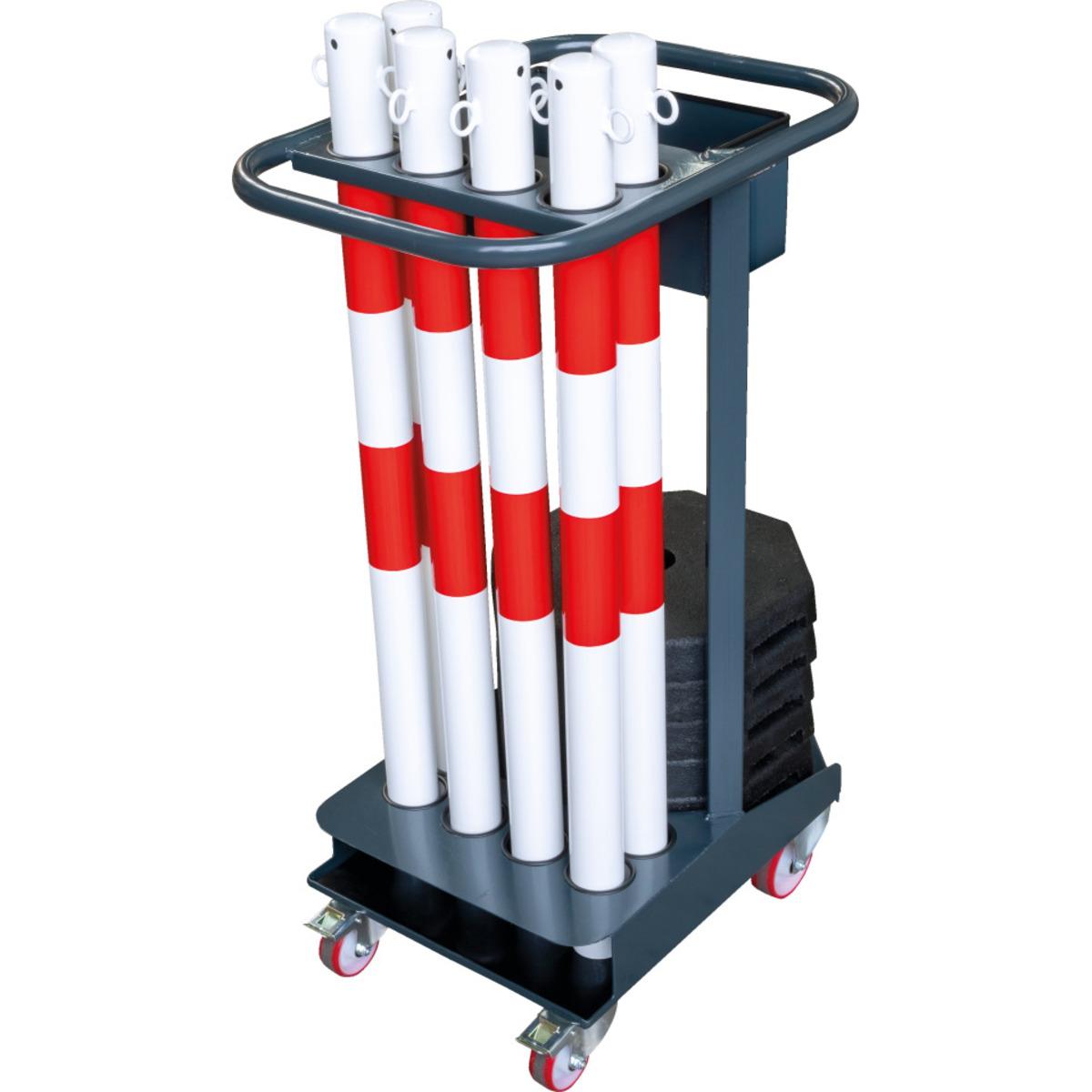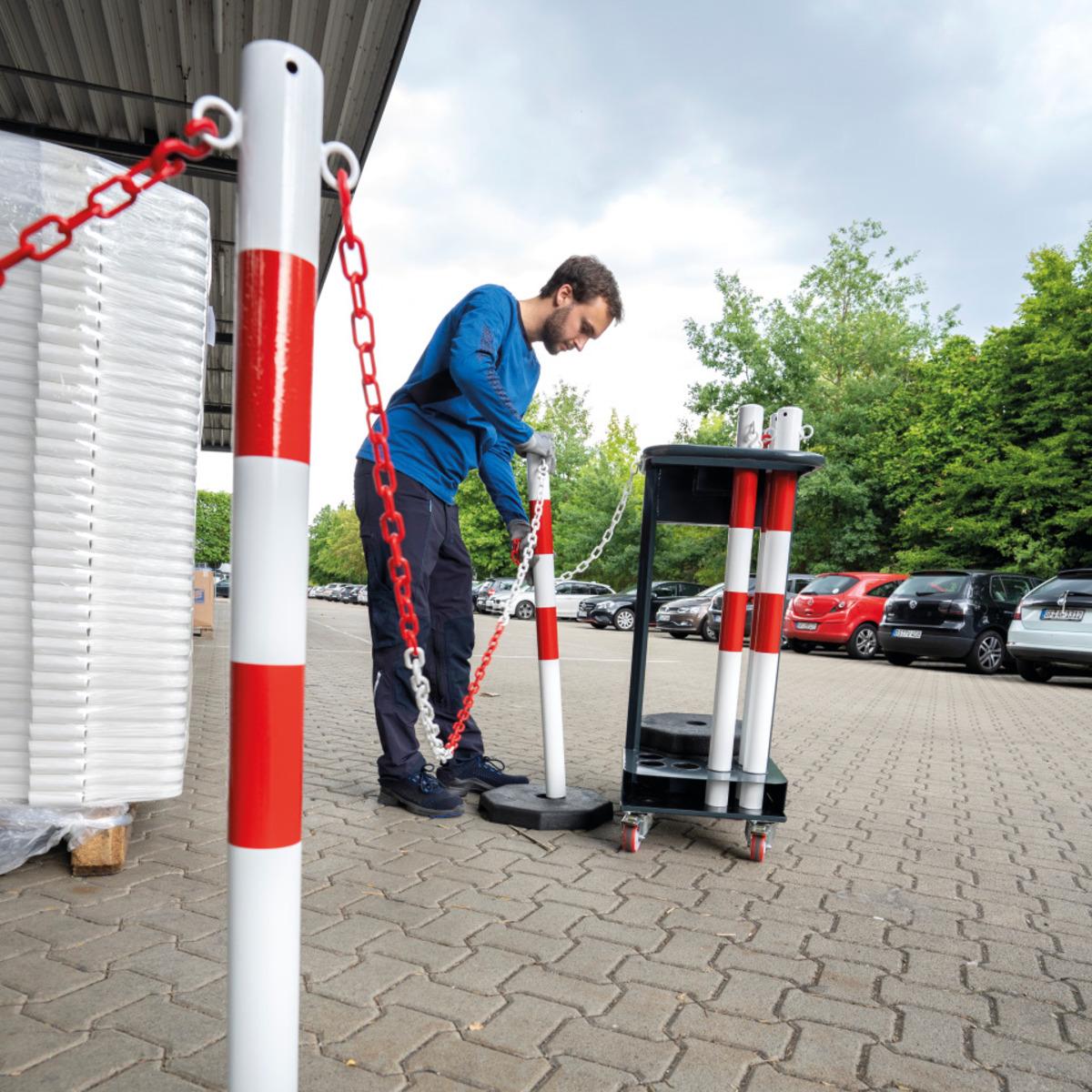 Kettenständer-Set Poly zum Einrichten von Absperrungen im Innen- oder Außenbereich, besonders leicht und schnell aufzubauen, abnehmbare Füße. Inklusive Caddie mit praktischem Rundumgriff, gummierten Rollen für geräuscharmes Gleiten und materialschonenden Gummieinlagen in den Sammelfächern, speziell für den Transport kompletter Absperrsysteme entwickelt.