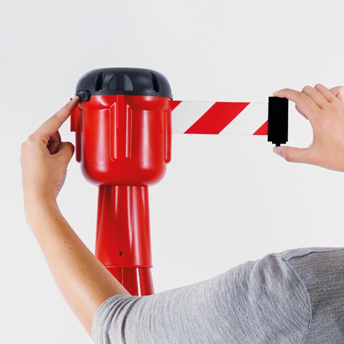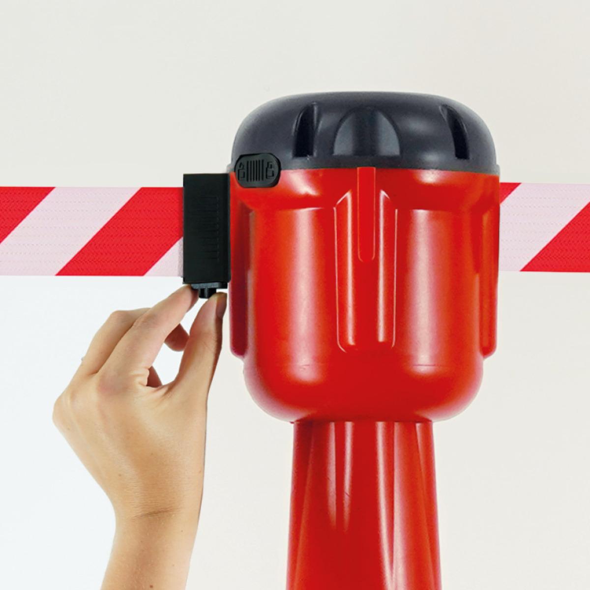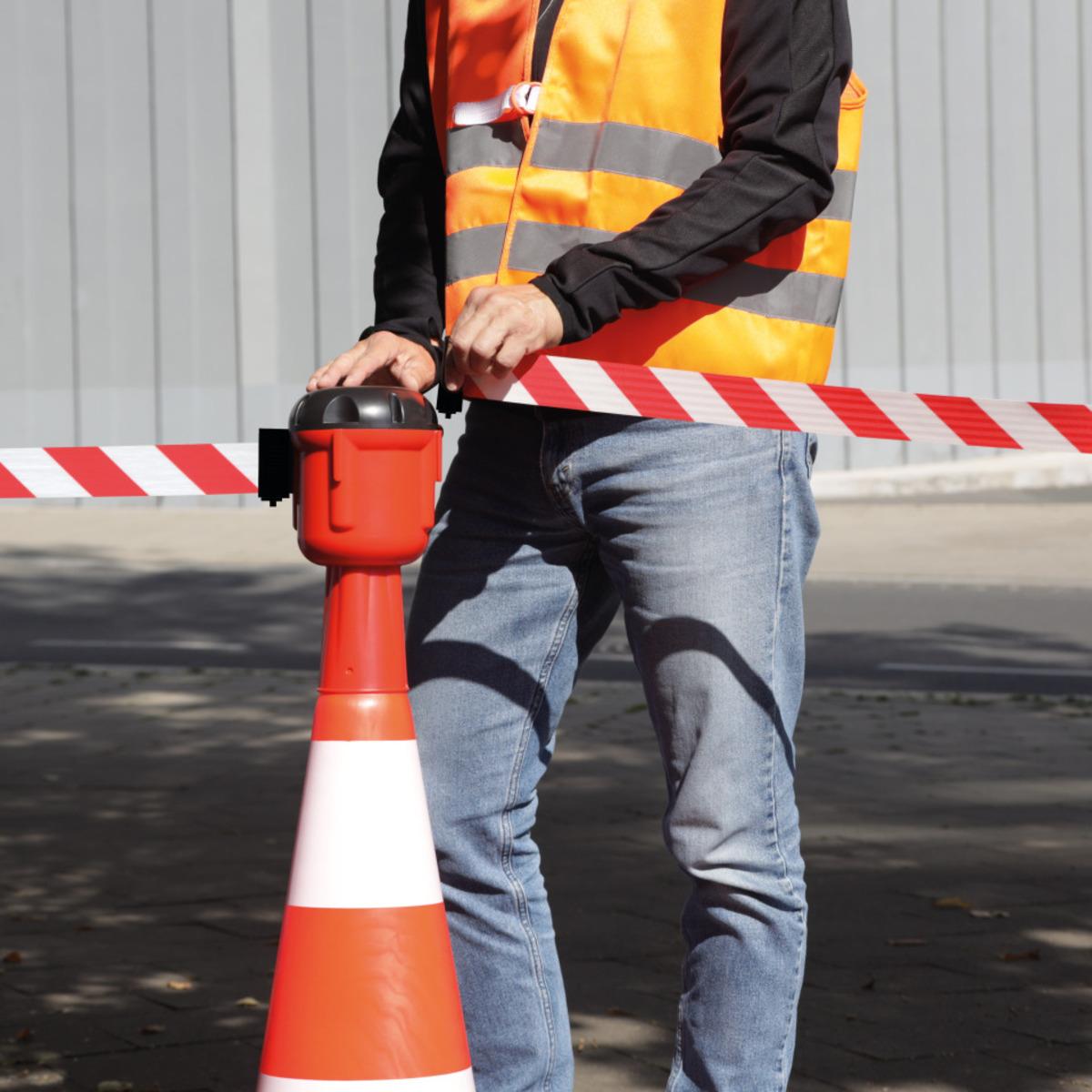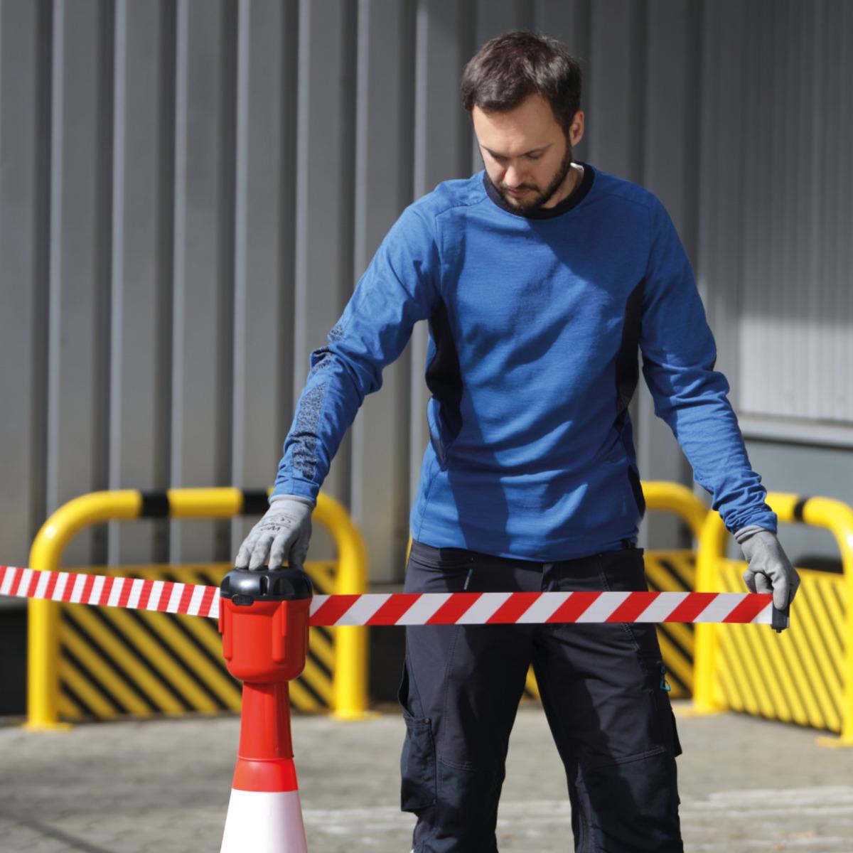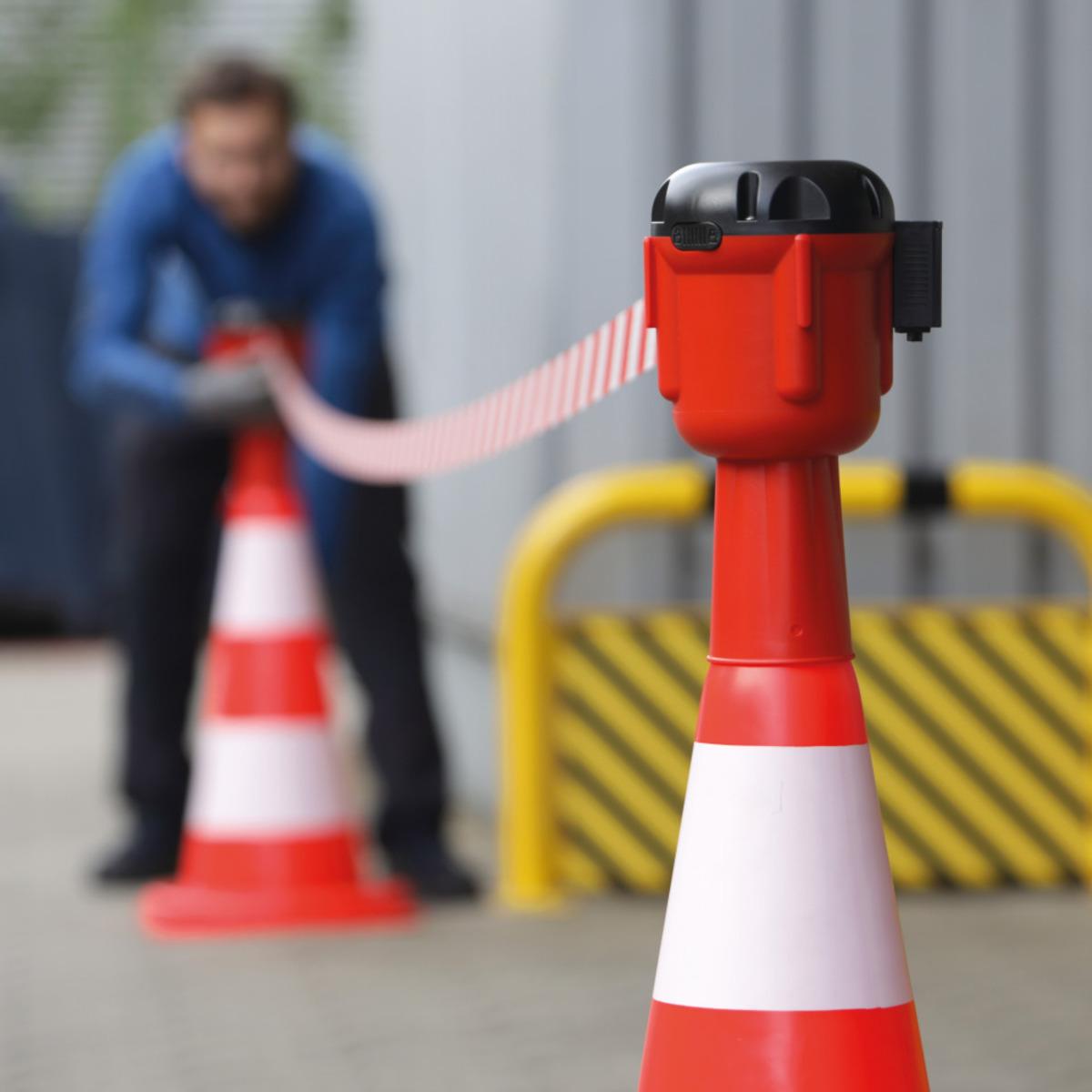 Leitkegelaufsatz mit schraffiertem Absperrband für Leitkegel ab 750 mm Höhe zum Verbinden mehrerer Kegel für eine effektive Gefahrstellensicherung, einfach aufzustecken, mit Aufrollautomatik und Andockmöglichkeit für 3 weitere Gurte. Rastsicherung zur Fixierung des Gurtendstückes und Arretierknopf um Auszug zu stoppen. Nicht für den öffentlichen Verkehrsraum.