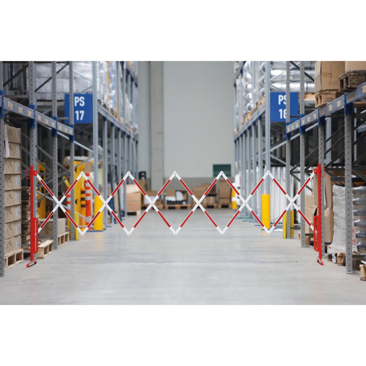 Die Scherensperre ist stufenlos ausziehbar und eignet sich ideal zur raschen Sicherung von Gefahrenstellen und zur effektiven Absperrung von Wegen, Durchgängen und sensiblen Bereichen.