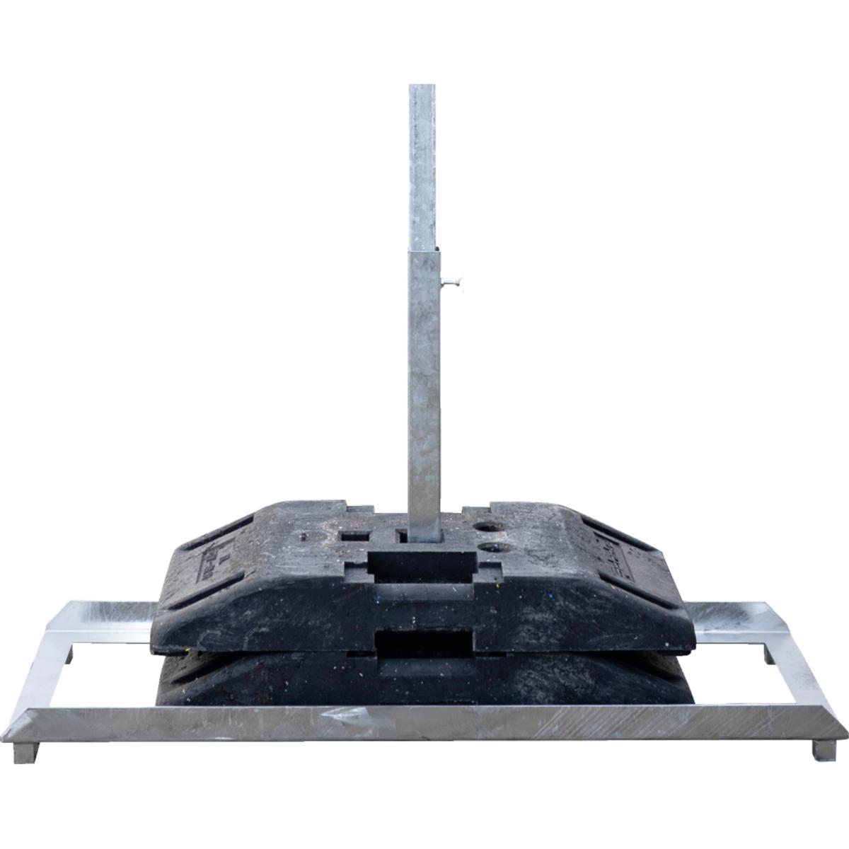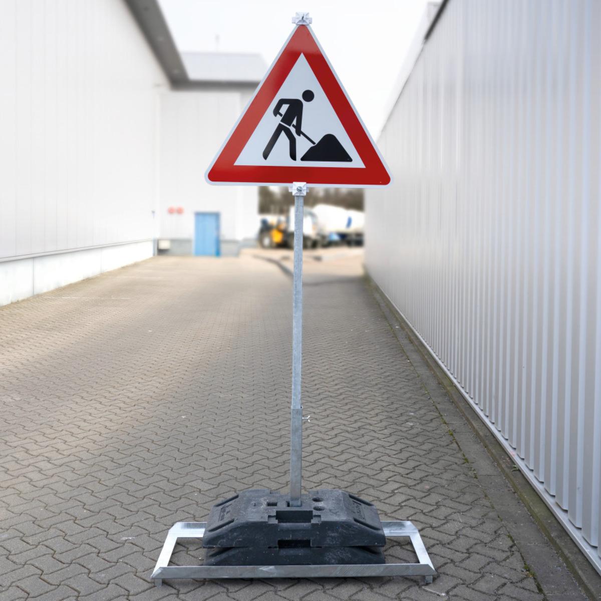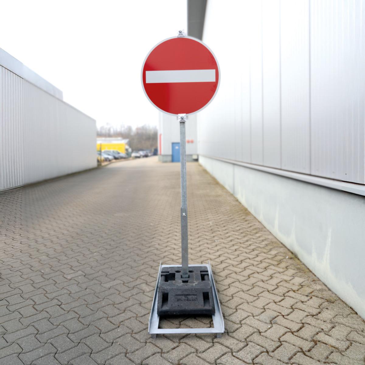 Zur standsicheren Aufstellung von mobilen Beschilderungen. Geeignet zum stapeln von Fußplatten und zur Aufnahme von Schaftrohren.