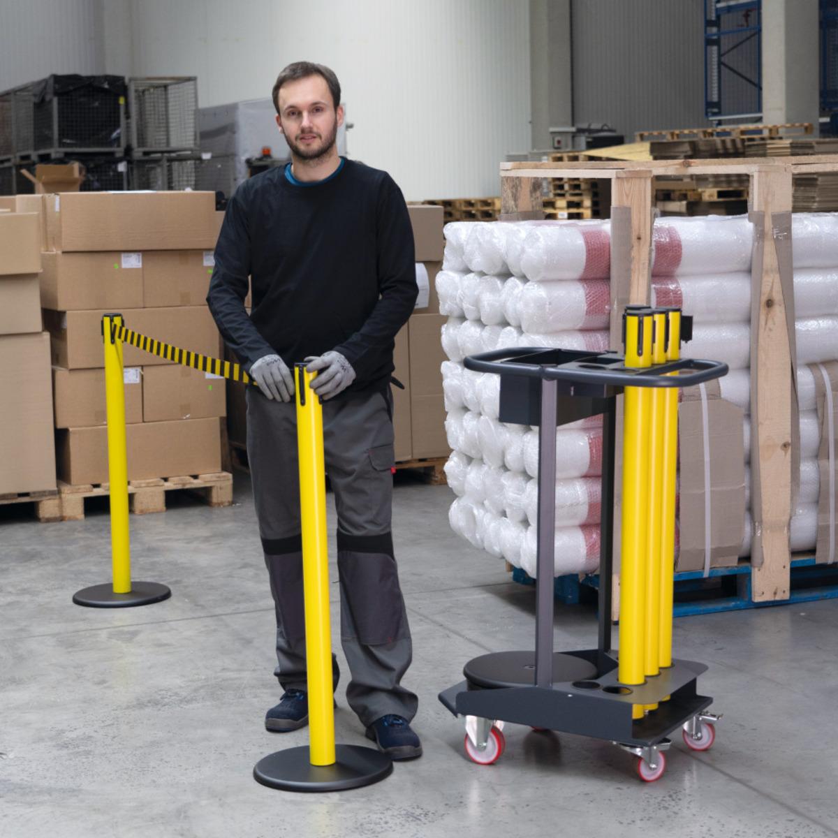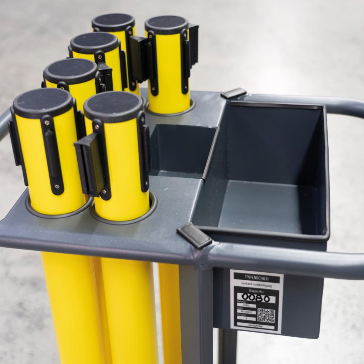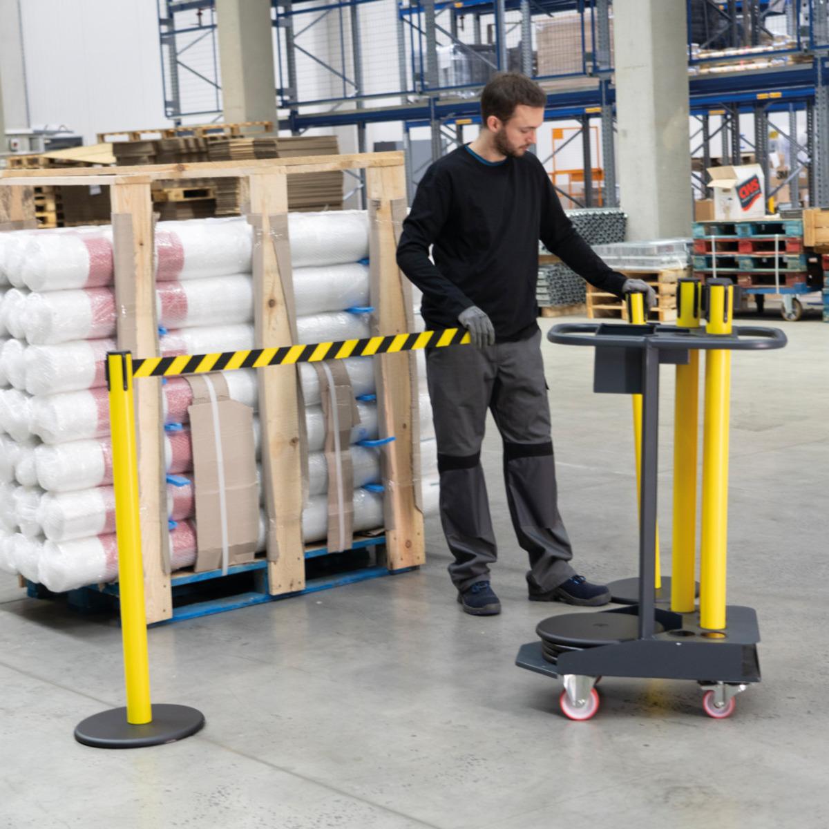 K.57 Transportwagen-Set mit Gurtpfosten aus Kunststoff beinhaltet K.57 Gurtpfosten und den Kettenpfosten-Wagen Caddie für den leichten Transport.