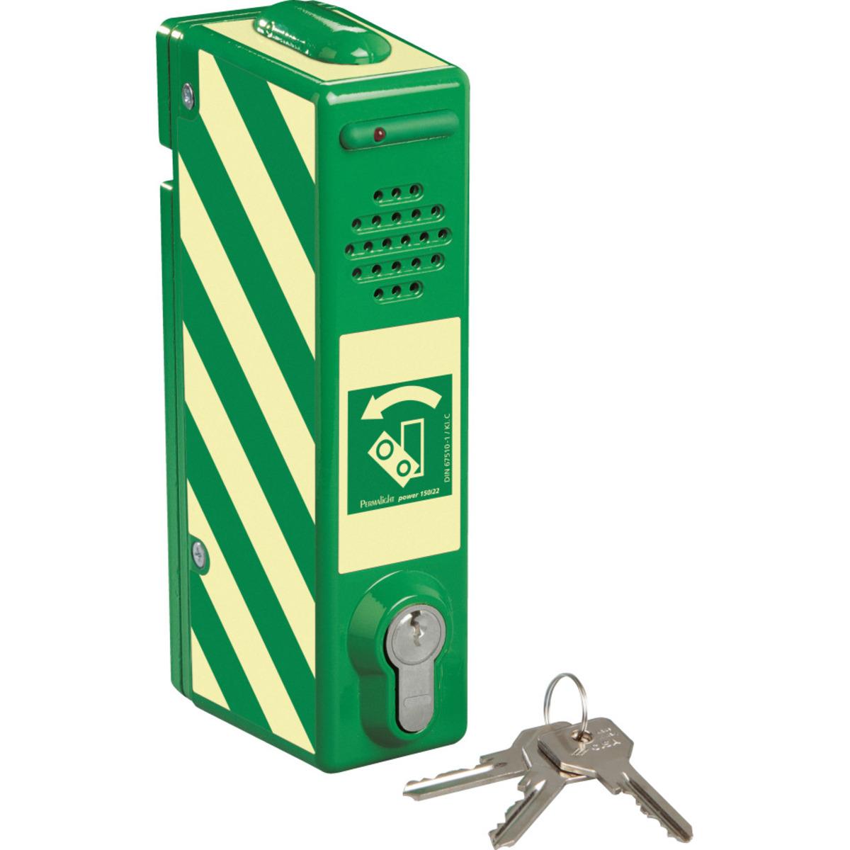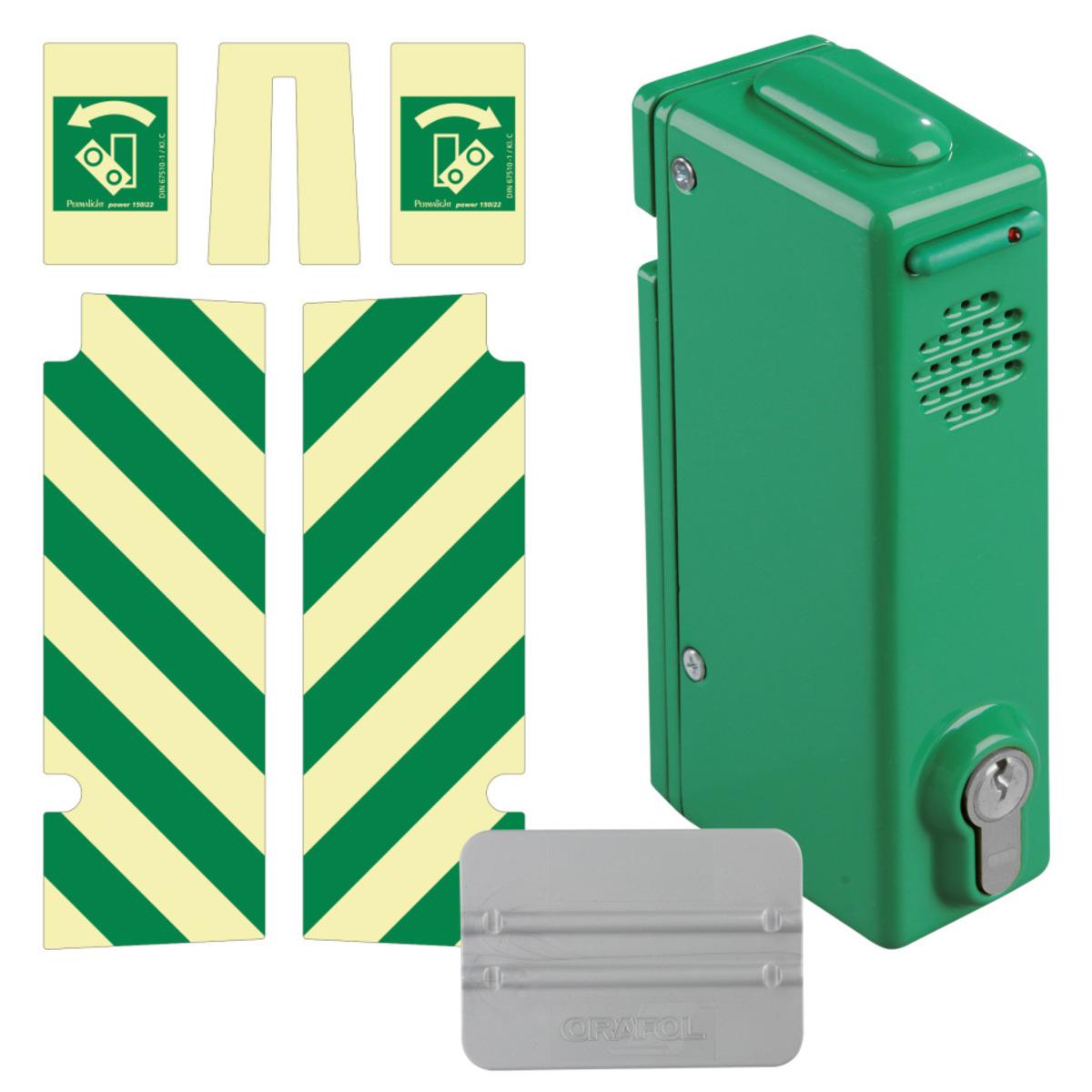 Türwächter zur Sicherung von Notausgängen mit lang nachleuchtenden PERMALIGHT® Power Aufklebern für gute Sichtbarkeit im Dunkeln, mit Rakel zum Aufbringen der Aufkleber. Mit Hilfe eines Schiebeschalters kann die Lautstärke des K.57 Türwächters nach Ihren Anforderungen eingestellt werden. Der batteriebetriebene Türwächter hat eine Kontrollleuchte, um den Ladezustand der Batterie zu prüfen (Betriebsdauer bis zu 10 Jahren, je Anzahl der Auslösungen). Montage im Innenbereich: Mit beiliegenden Befestigungsschrauben und Bohrschablone anschrauben oder selbstklebende Montageplatten nutzen. Er ist für netzunabhängig und für rechte und linke Türen geeignet.