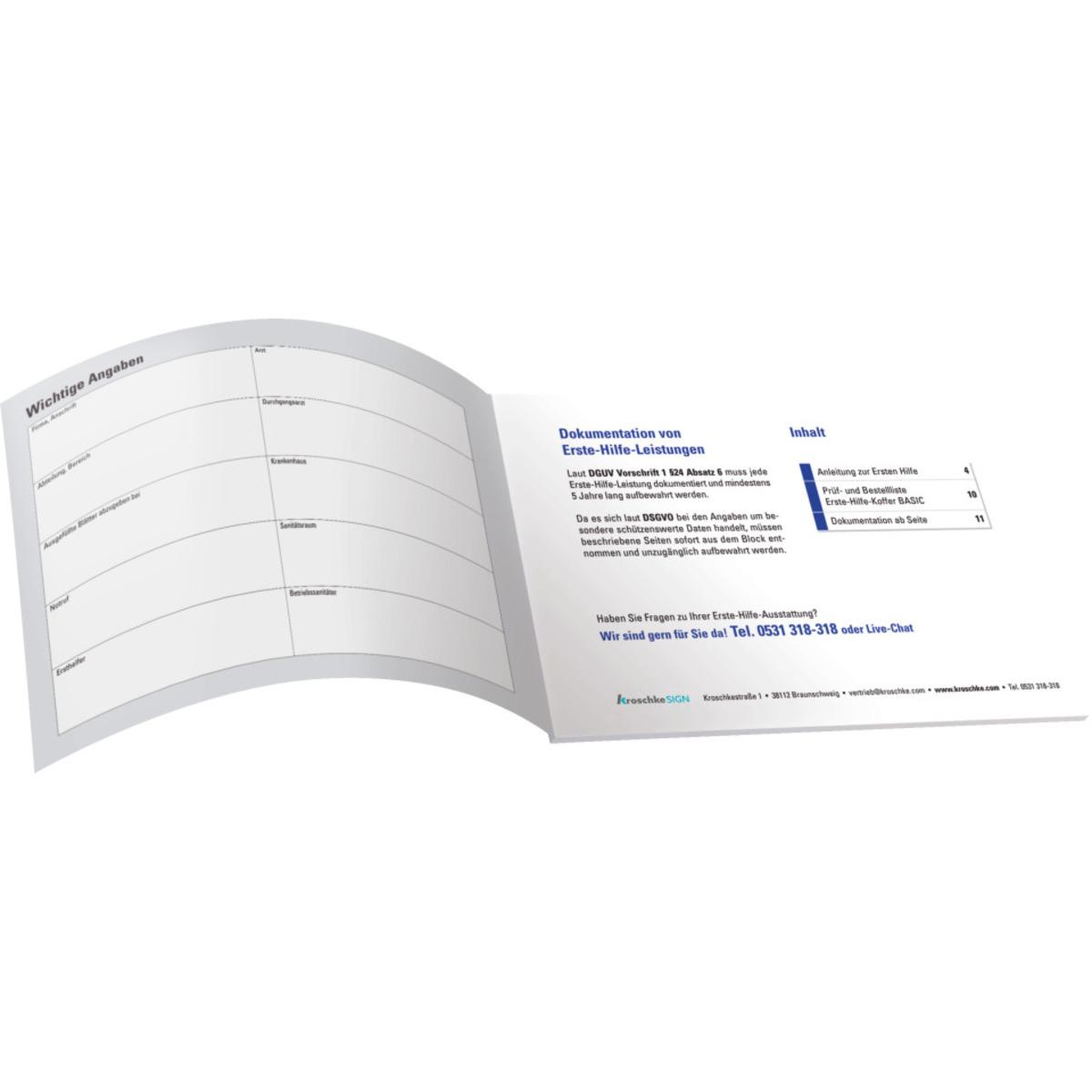 Verbandblock für eine lückenlose Dokumentation von geleisteten Erste-Hilfe-Maßnahmen. Perforation zur einzelnen Entnahme ausgefüllter Blätter sorgt für mehr Datenschutz. Inklusive Anleitung zur Ersten Hilfe nach DGUV 204-006.