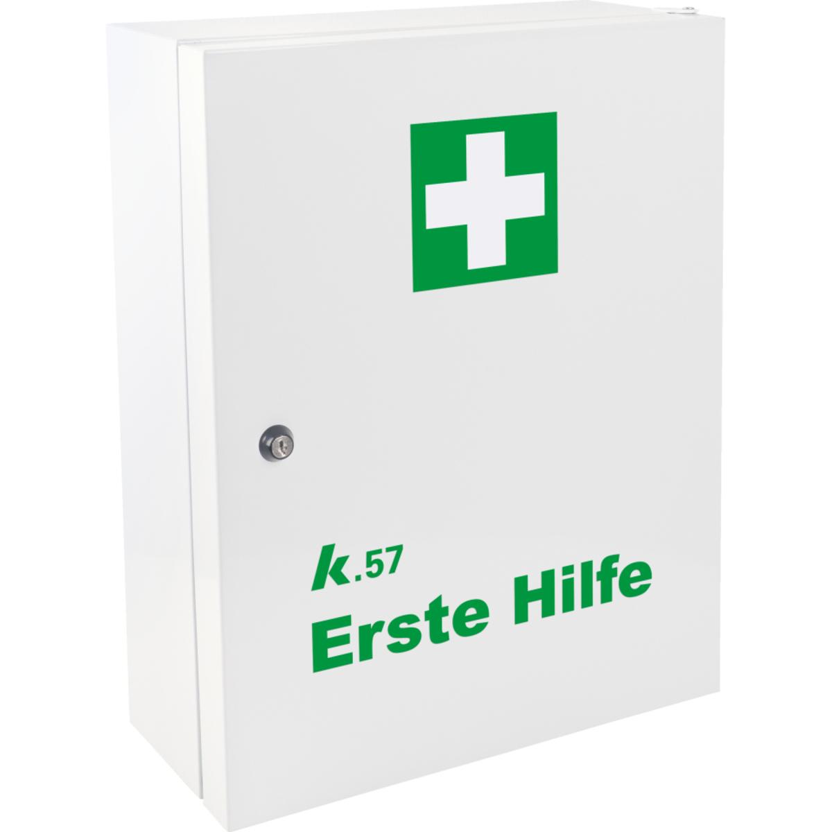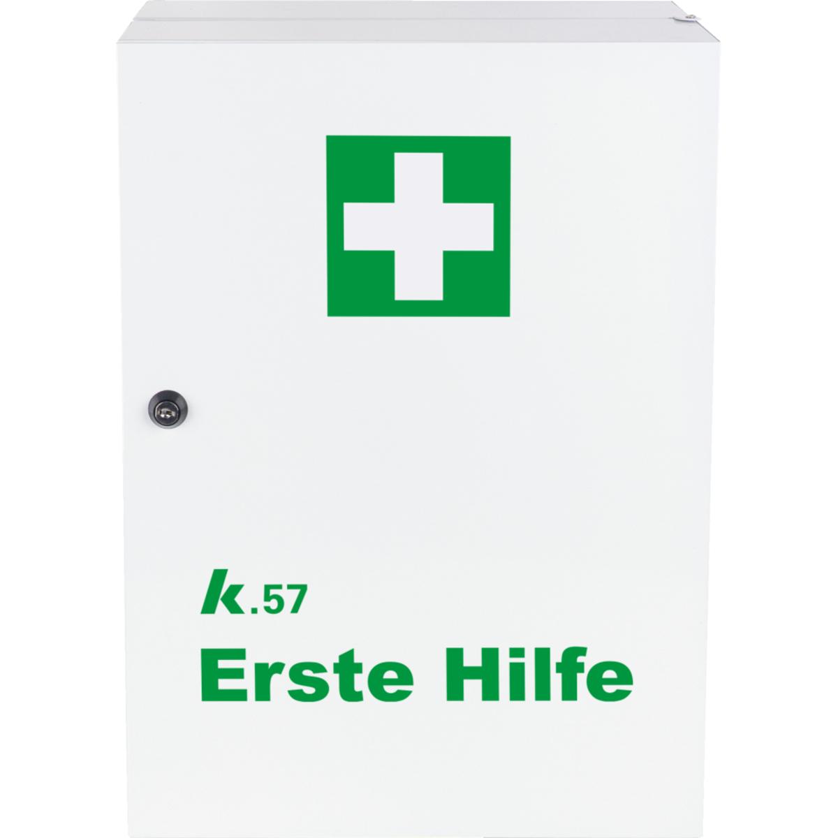 Abschließbarer Verbandschrank von K.57 zur Aufbewahrung von Erste-Hilfe-Material, 1-türig, zur festen Wandmontage.