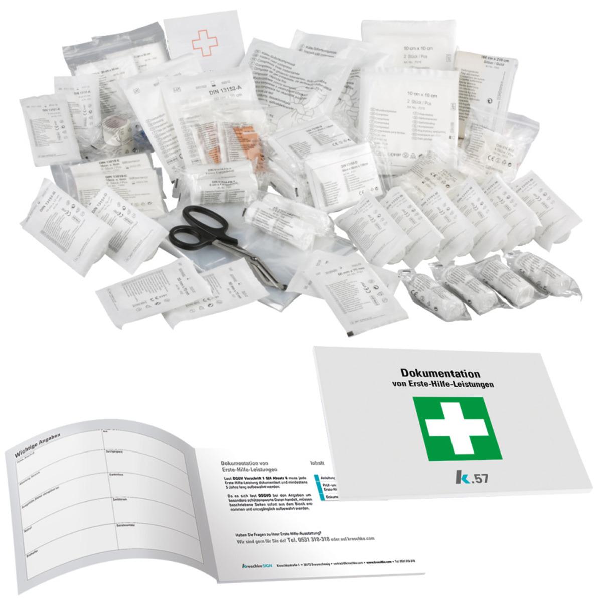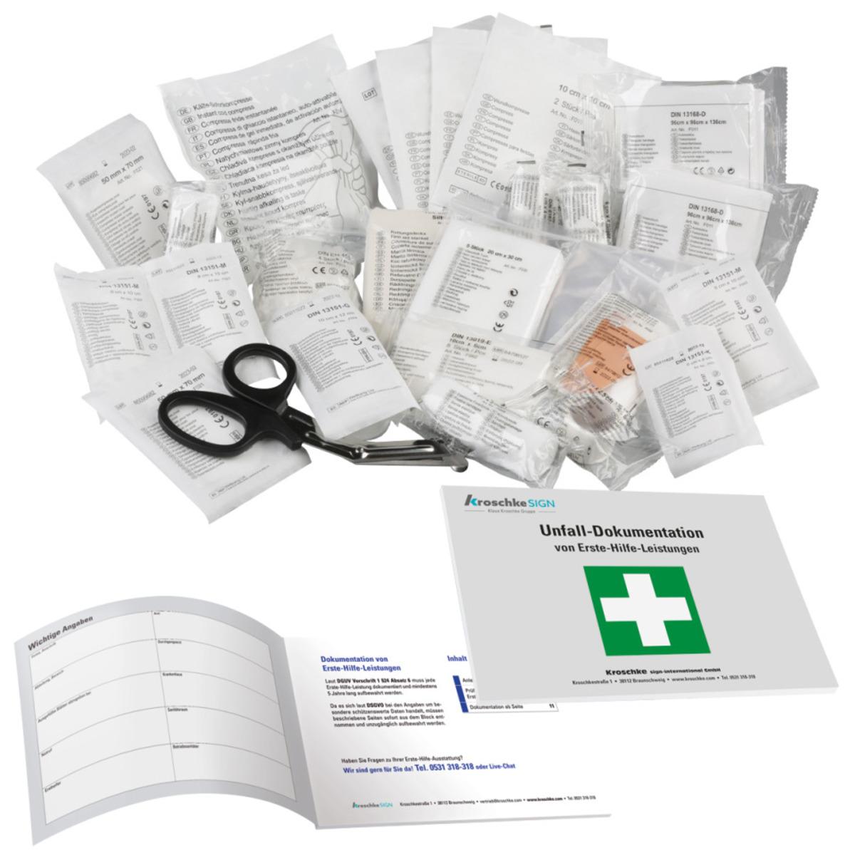 Praktisches Vorteils-Set mit hygienisch verpacktem Nachfüllset für Verbandkästen, -koffer und -schränke sowie Verbandblock zur Dokumentation durchgeführter Erste-Hilfe-Leistungen.