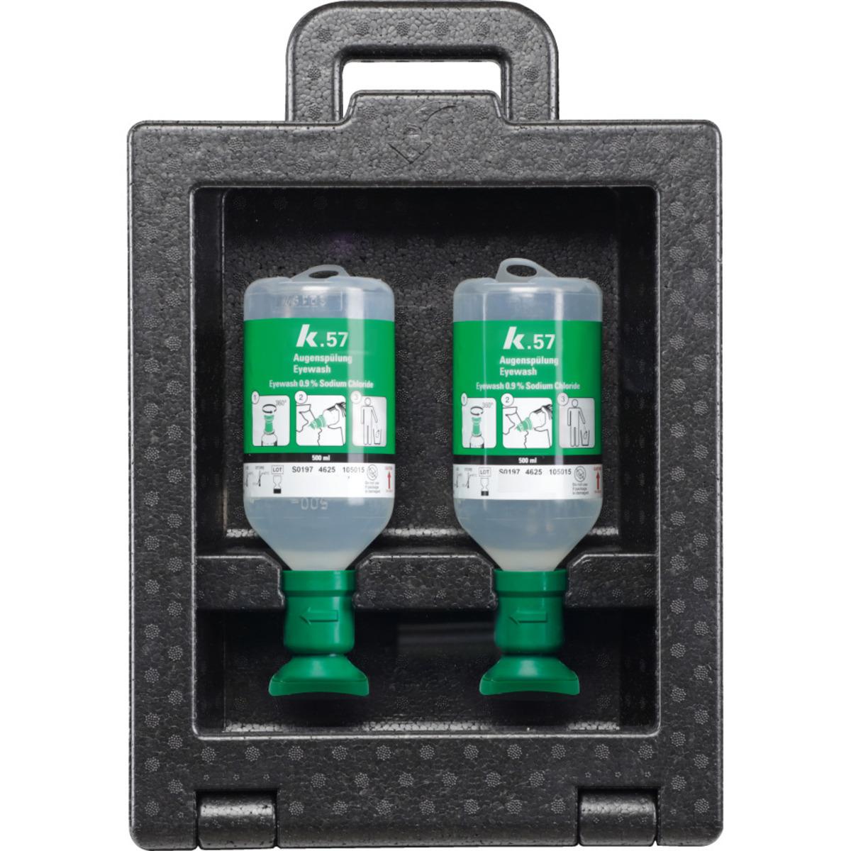 Schwarze Wandbox mit Augenspülungen in Form von 2x 500-ml-Flaschen.