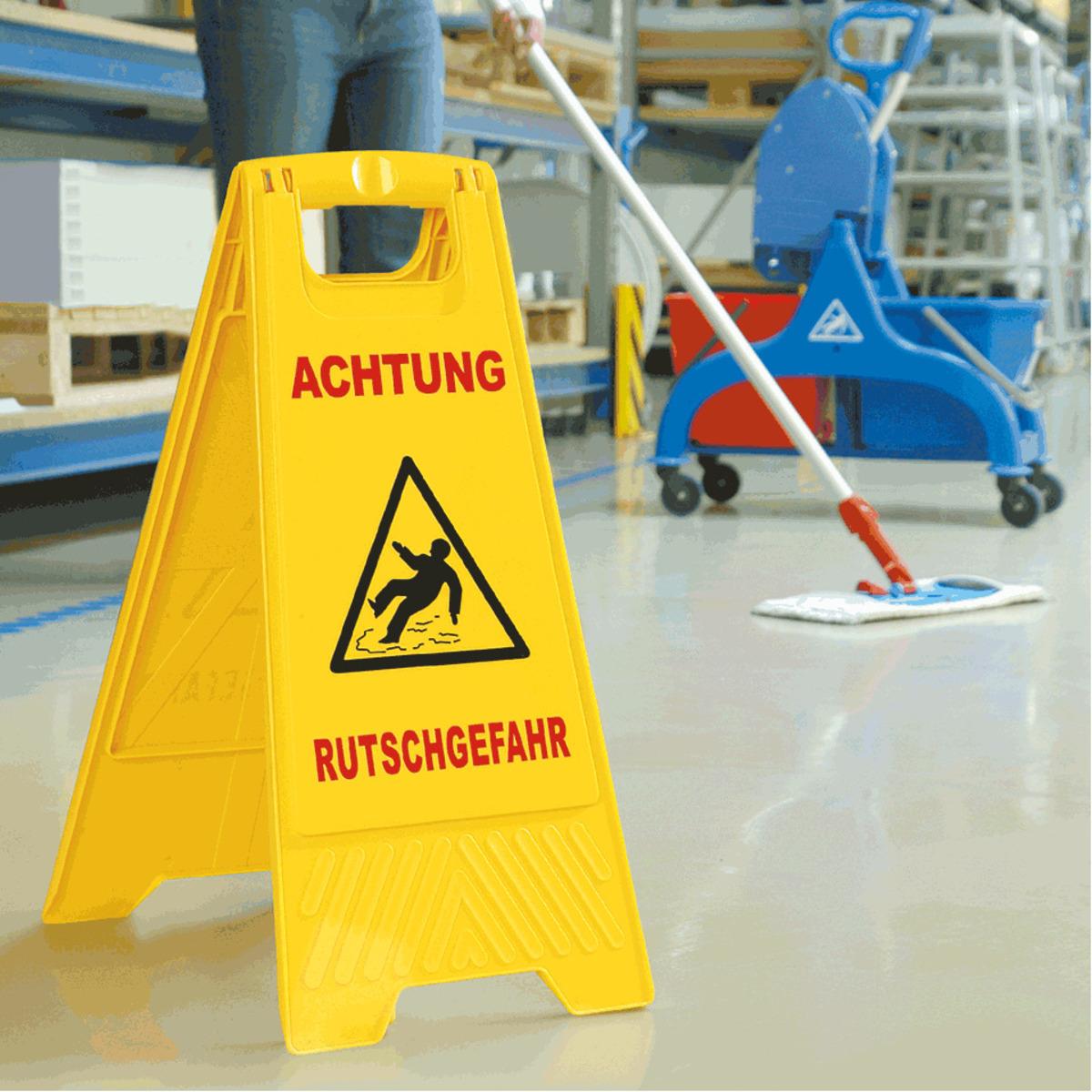 Der Warnaufsteller Stabil warnt auffällig vor Rutschgefahr mit Text und Symbol. Die stabile Kunststoff-Ausführung ist doppelseitig bedruckt, abwaschbar und platzsparend zusammenklappbar.