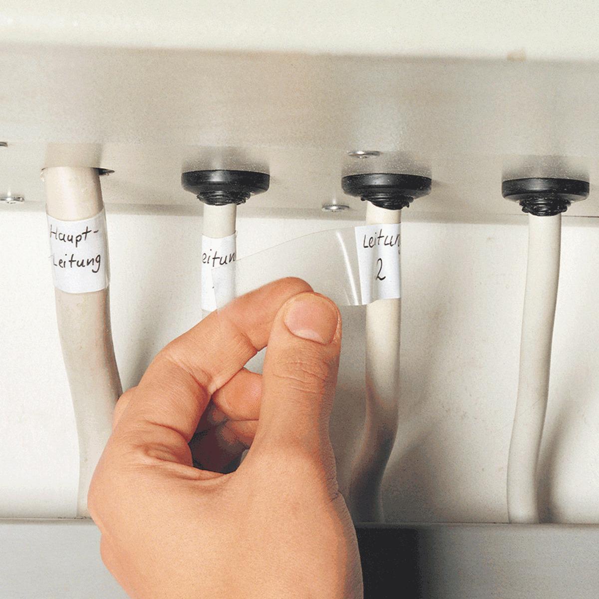 Die Kabelmarkierer zum Selbstbeschriften ermöglichen eine dauerhafte Kennzeichnung: Schriftseite am Kabel auflegen, mit Schutzlaminat umwickeln, fertig. Beschriftbar per Schreibmaschine, Kugelschreiber oder Bleistift.