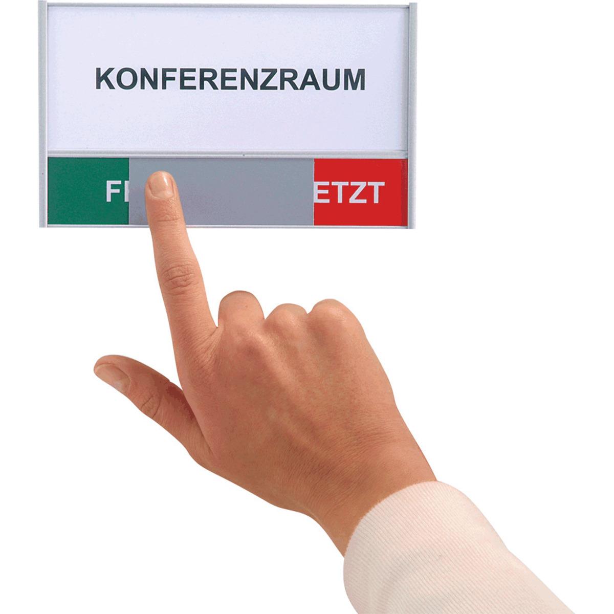 Dieses Türschild verbindet Raumbeschilderung mit einer Frei-/Besetzt-Anzeige und eignet sich hervorragend zur Kennzeichnung von beispielsweise Besprechungsräumen. Der Schieberegler kann flexibel verstellt werden und zeigt an, ob ein Zimmer belegt ist oder zur Verfügung steht. Eine individuelle Beschriftung ist für jeden Bedarf möglich.