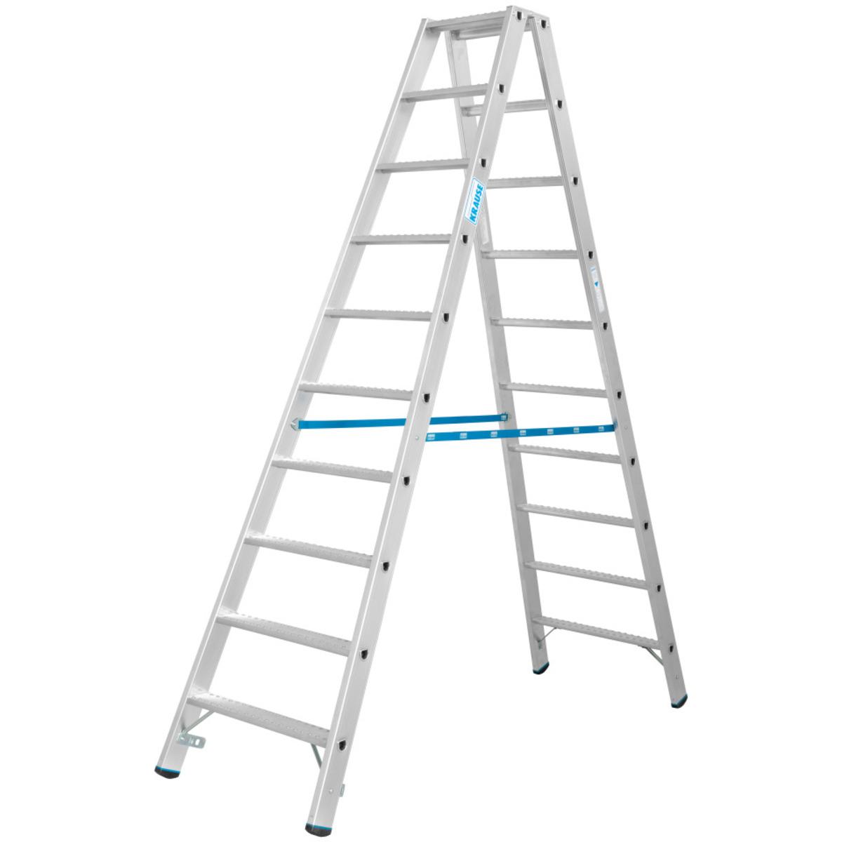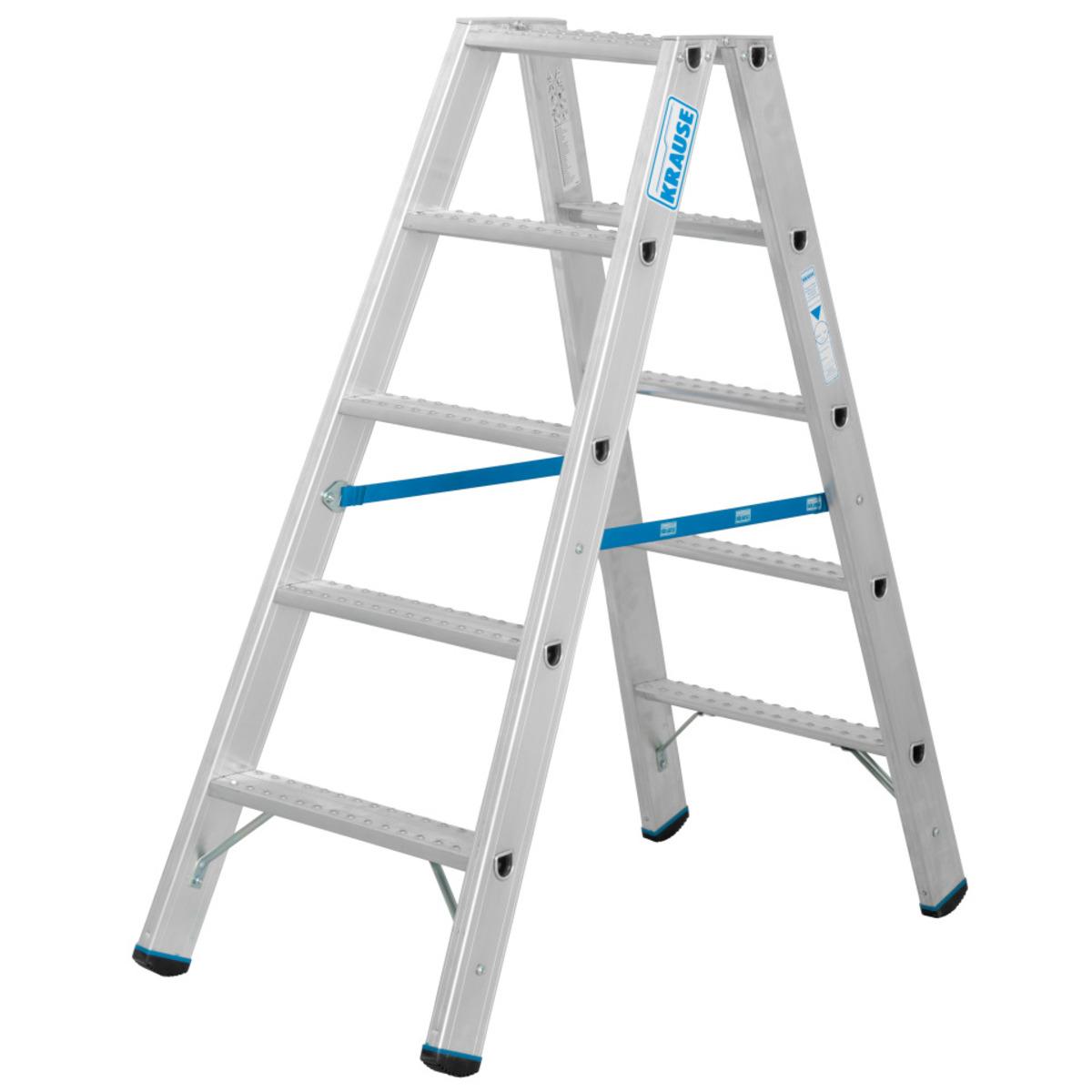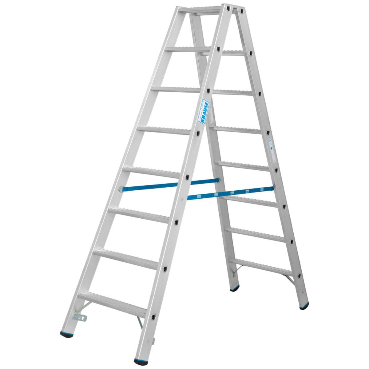 Die beidseitig begehbare KRAUSE® Stufen-Doppelleiter besitzt stabile Steig- und Stützholme aus Aluminium-Rechteckrohr mit tiefen, profilierten Stufen. Die Leiter ist ausgestattet mit Hochfest verbördelte Stufen-/Holmverbindung, Schutzkappen an den Stufen und rutschsicheren Fußkappen. Spreizsicherung durch verschraubte und austauschbare Gurte.