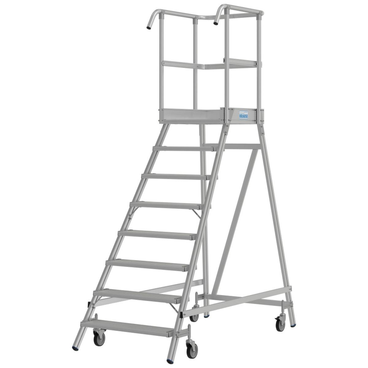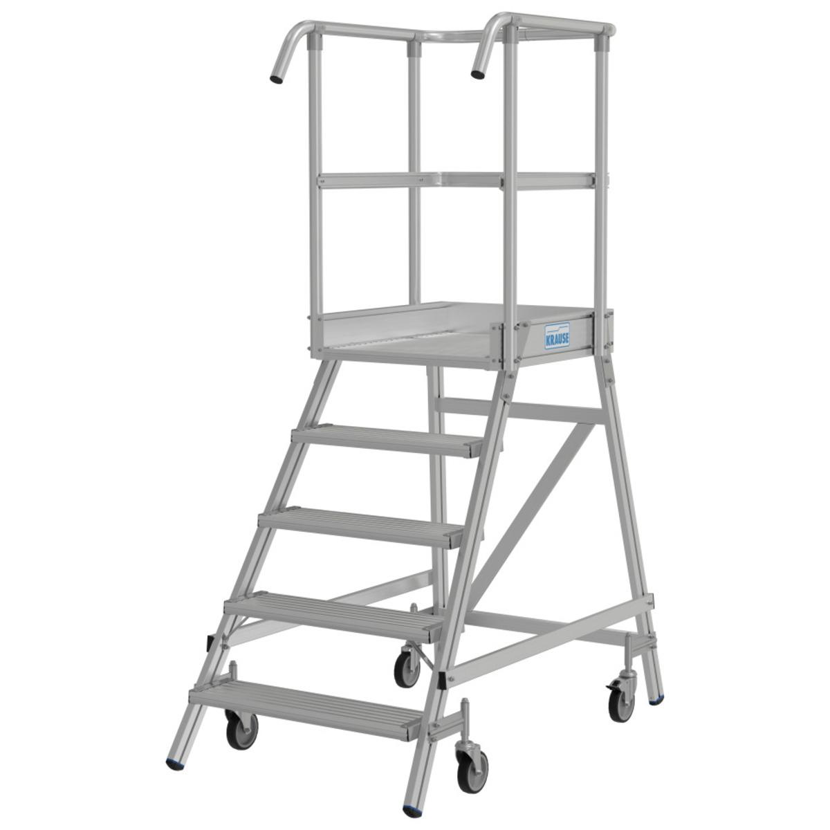 Die einseitig begehbare KRAUSE ® Podestleiter mit Plattform und Geländer bietet besondere Sicherheit beim Auf- und Abstieg durch geriefte Alu-Stufen. Inkl. 4 selbstarretierenden Lenkrollen davon zwei mit Feststellern.