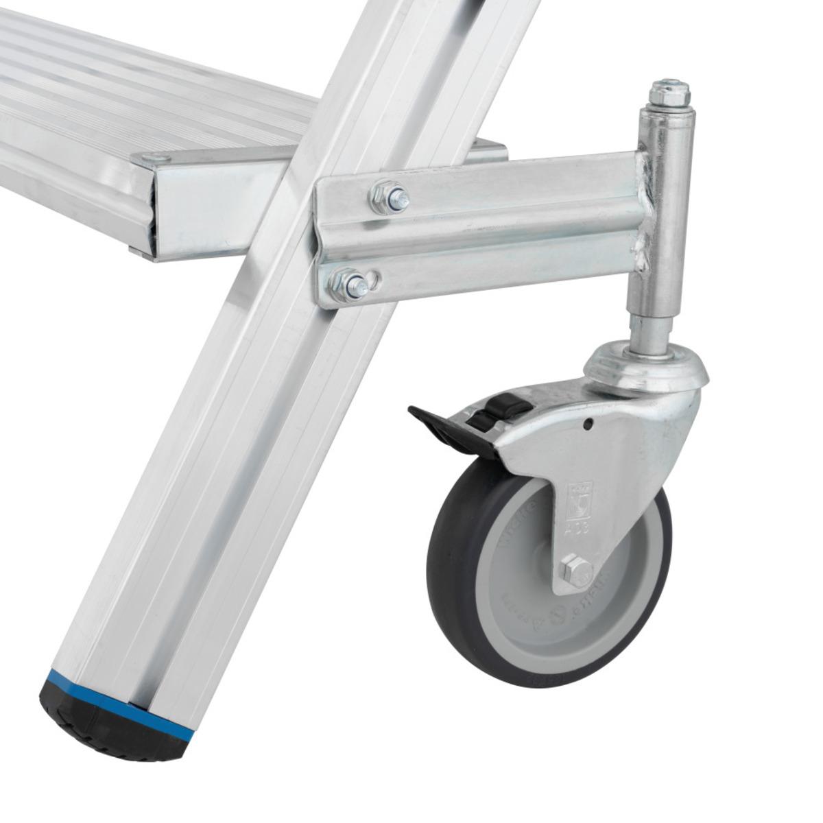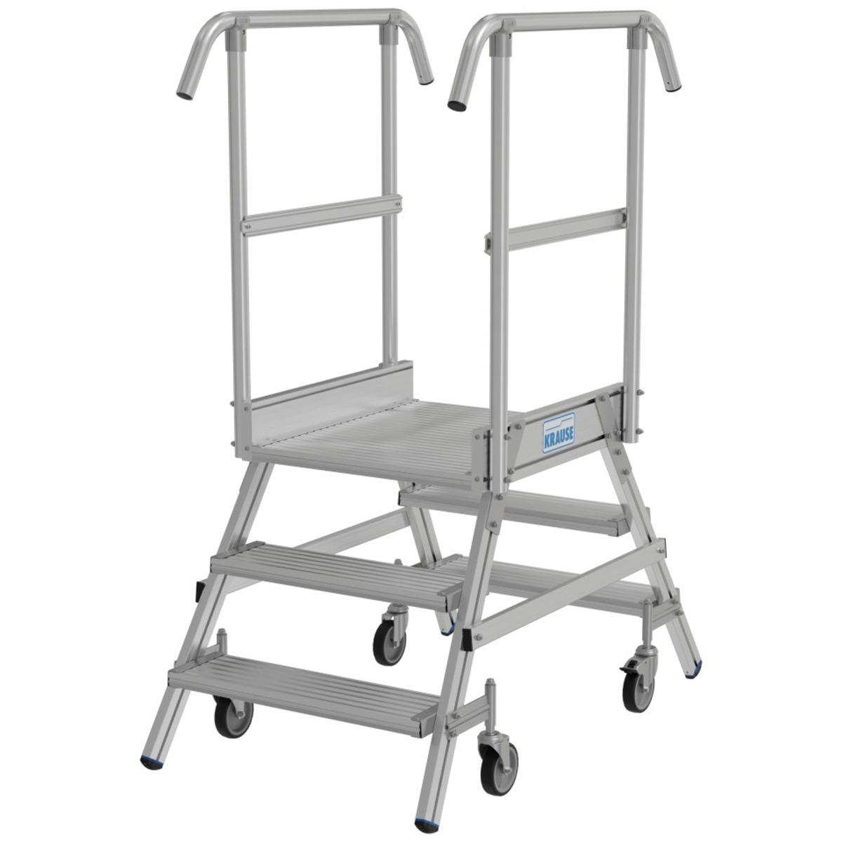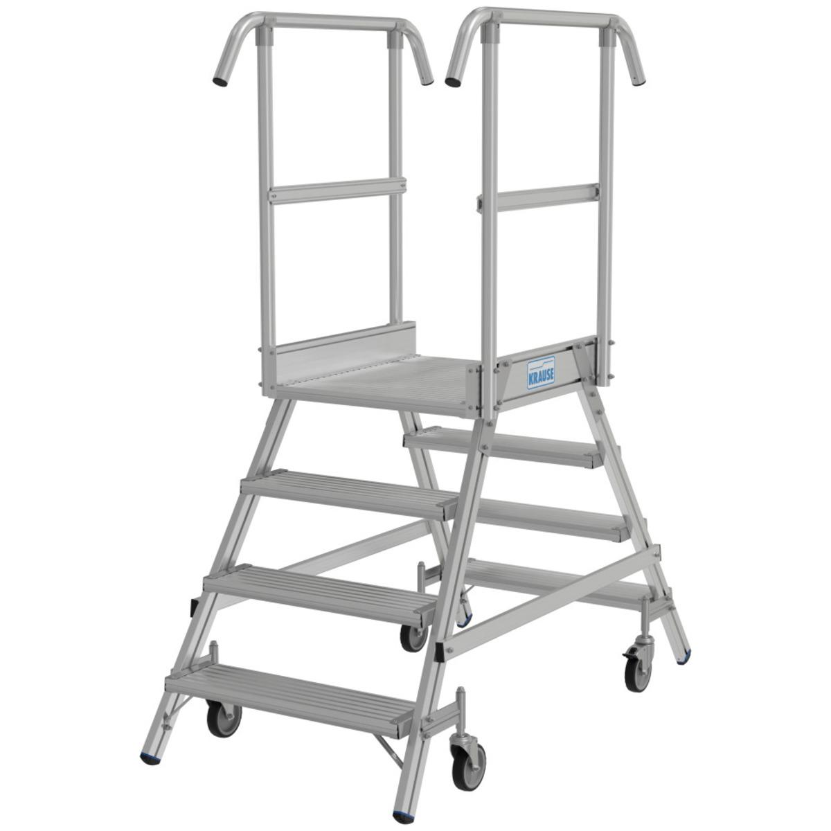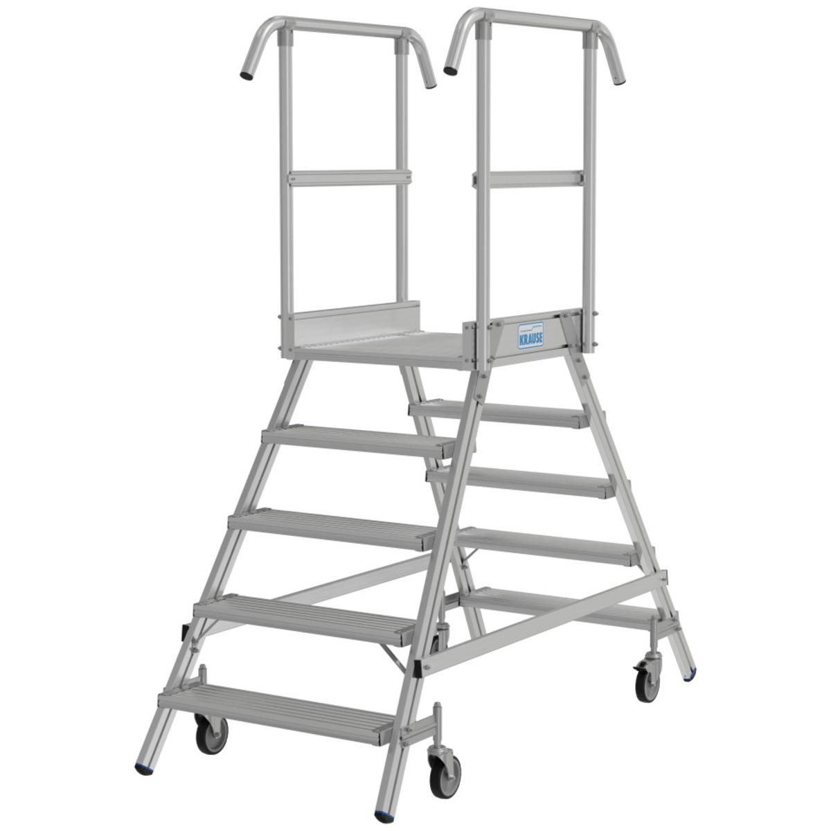 Die zweiseitig begehbare KRAUSE ® Podestleiter bietet besondere Sicherheit beim Auf- und Abstieg durch geriffelte Alu-Stufen. Inkl. 4 selbstarretierenden Lenkrollen davon zwei mit Feststellern.