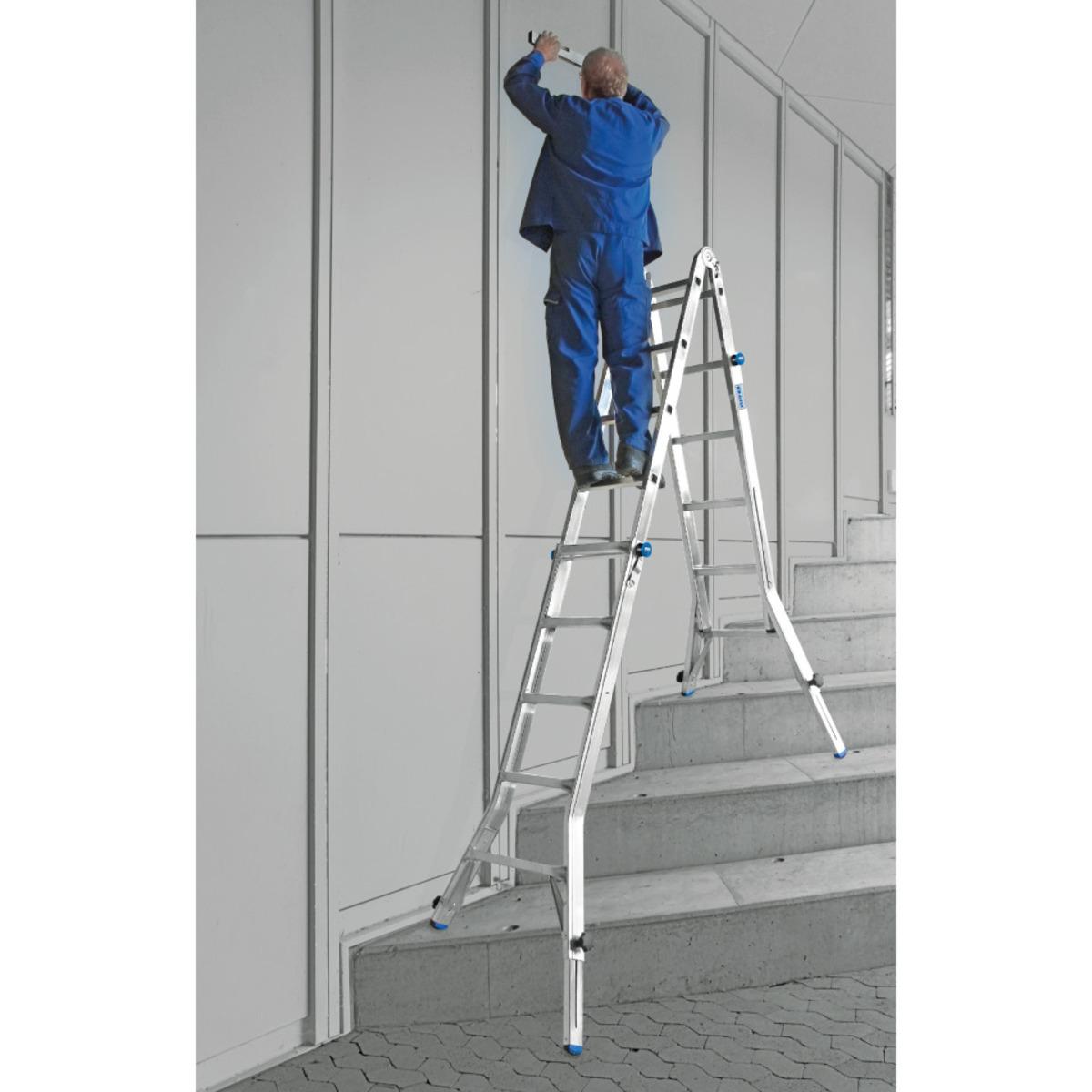 Die TÜV-geprüfte Sprossen-Gelenk-Teleskop Leiter mit 4 Holmverlängerungen zum Höhenausgleich ist einsetzbar als Anlege-, Doppel-Stehleiter und Arbeitsbühne (in Verbindung mit dem TeleBoard), patentiertes ClickMatic-System für komfortable Höhenverstellung, 4 integrierte Holmverlängerungen an den Leiternaußenteilen, Leiterninnenteil und Leiternaußenteile ergeben 2 separate Stehleitern, Eckverstrebungen für zusätzliche Stabilität, Innenleiter als Stehleiter nur mit Combi-Traverse, rutschhemmende Fußkappen.