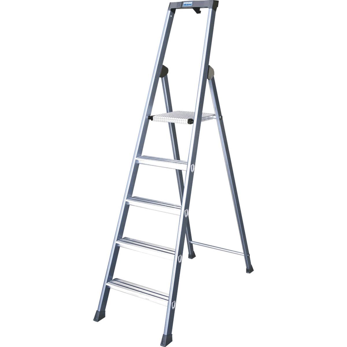 Einseitig begehbare, eloxierte Stufen-Stehleiter von KRAUSE® mit hohem Sicherheitsbügel und großer rutschsicherer Alu-Trittplatte. Abriebfeste eloxierte Steig- und Stützholme verhindern ein Verschmutzen der Hände. Ergonomisch geformte Ablageschale zur Aufnahme von Werkzeugen mit integriertem Eimerhaken. Große Fußkappen gewährleisten sicheren Stand. Verbördelte Stufen-/ Holmverbindung gewährleisten eine hohe Haltbarkeit. Die stabilen Gelenkböcke verbinden das Steig- und Stützteil und bewirken somit eine hohe Gesamtstabilität der Leiter.