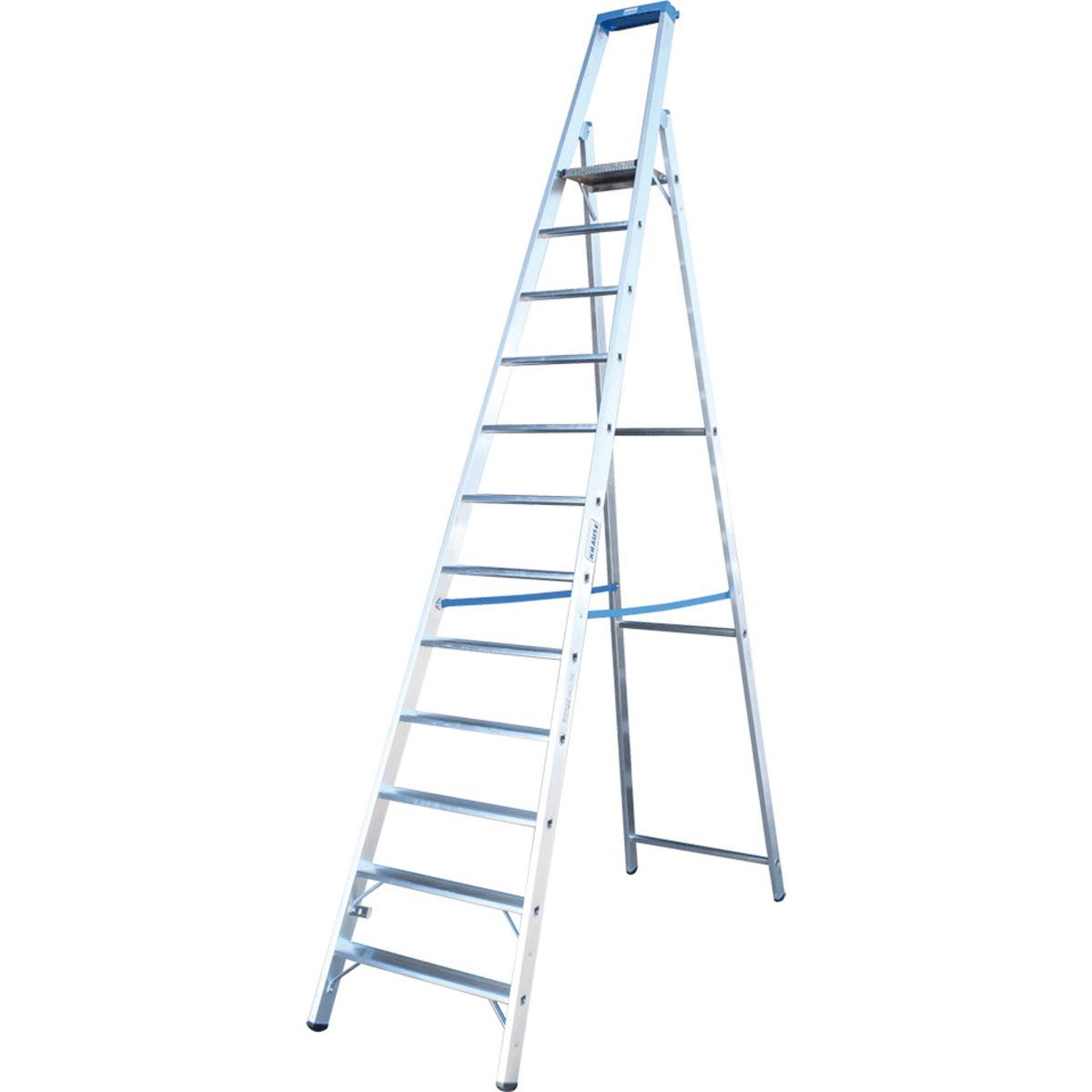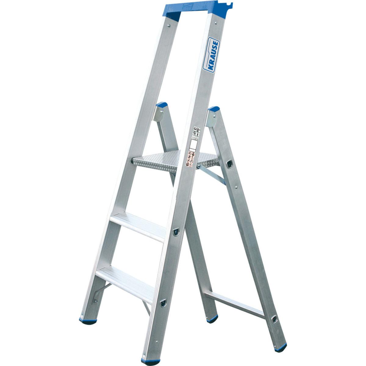 Einseitig begehbare Stufen-Stehleiter von KRAUSE® mit hohem Sicherheitsbügel, großer rutschsicherer Alu-Trittplatte und profilierten Stufen. Ergonomisch geformte Ablageschale zur Aufnahme von Werkzeugen mit integriertem Eimerhaken. Große Fußkappen gewährleisten sicheren Stand. Die stabilen Gelenkböcke (mit Schutzstopfen zur Vermeidung von Quetschungen) verbinden das Steig- und Stützteil und bewirken somit eine hohe Gesamtstabilität der Leiter.
