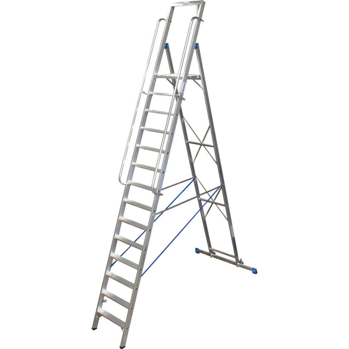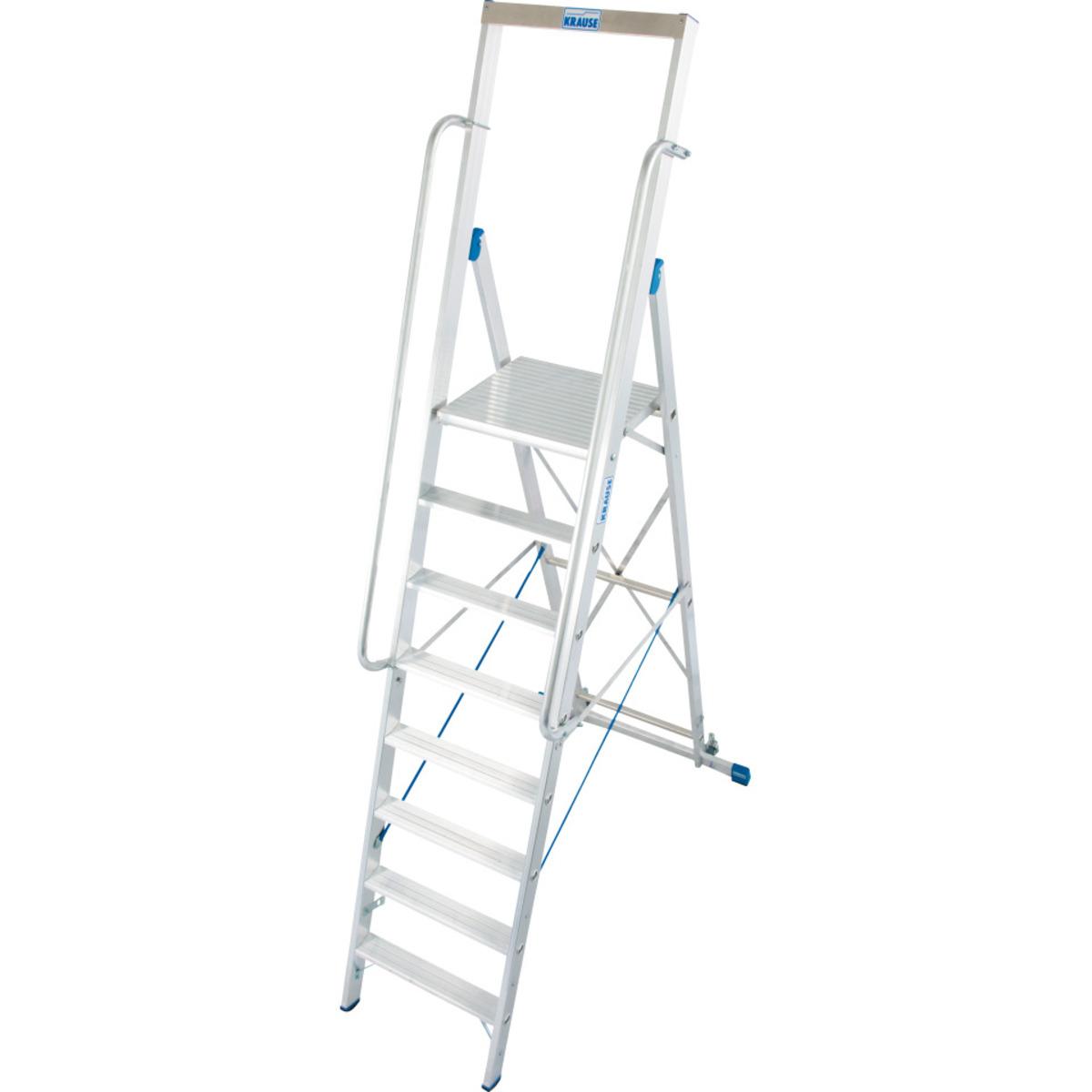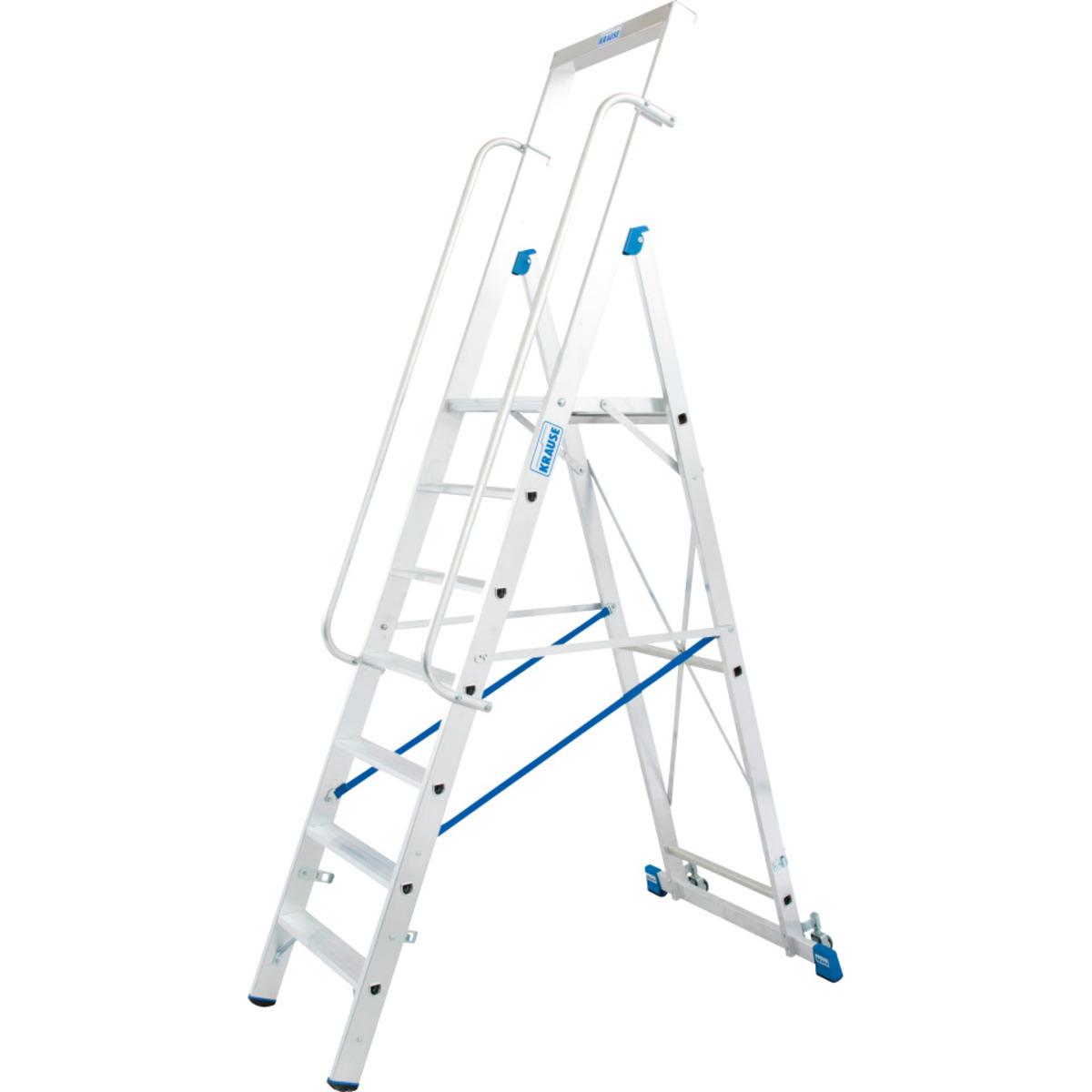 Einseitig besteigbare, fahrbare Alu-Stehleiter von KRAUSE® mit hohem Sicherheitsbügel und großer, stabiler Alu-Plattform. Neuartige, Stabile Quertraverse mit integrierten Fahrrollen sorgt für einen sicheren Stand sowie einen leichten Transport der Leiter. Beidseitig angebrachte Handläufe gewähren einen sicheren Auf- und Abstieg. Leicht zu verfahren, schnell zusammengeklappt für den einfachen Transport und eine platzsparende Unterbringung, integrierte Zug- und Drucksicherungen für einen sicheren Stand.